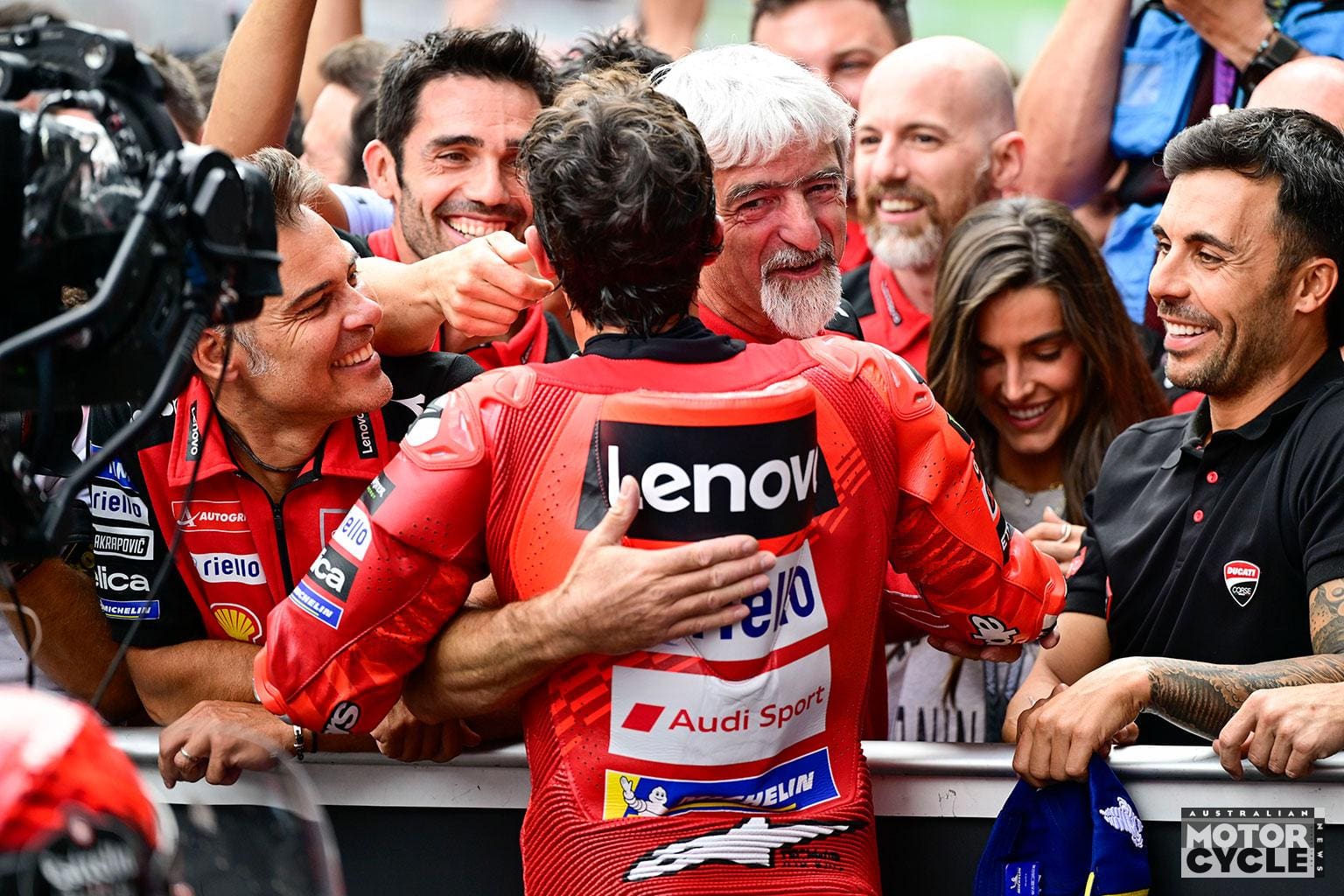The podium fight exploded as Acosta and Aldeguer devoured Bagnaia, a forceful move from Acosta pushing Pecco wide and gifting Aldeguer the drive to jump them both – before the rookie Spaniard dispatched Acosta through the second half of the chicane. Up front Marc was now crawling all over Bezzecchi’s rear tyre, finally employing a wider line into turn 3 to blast by forcefully on the exit.