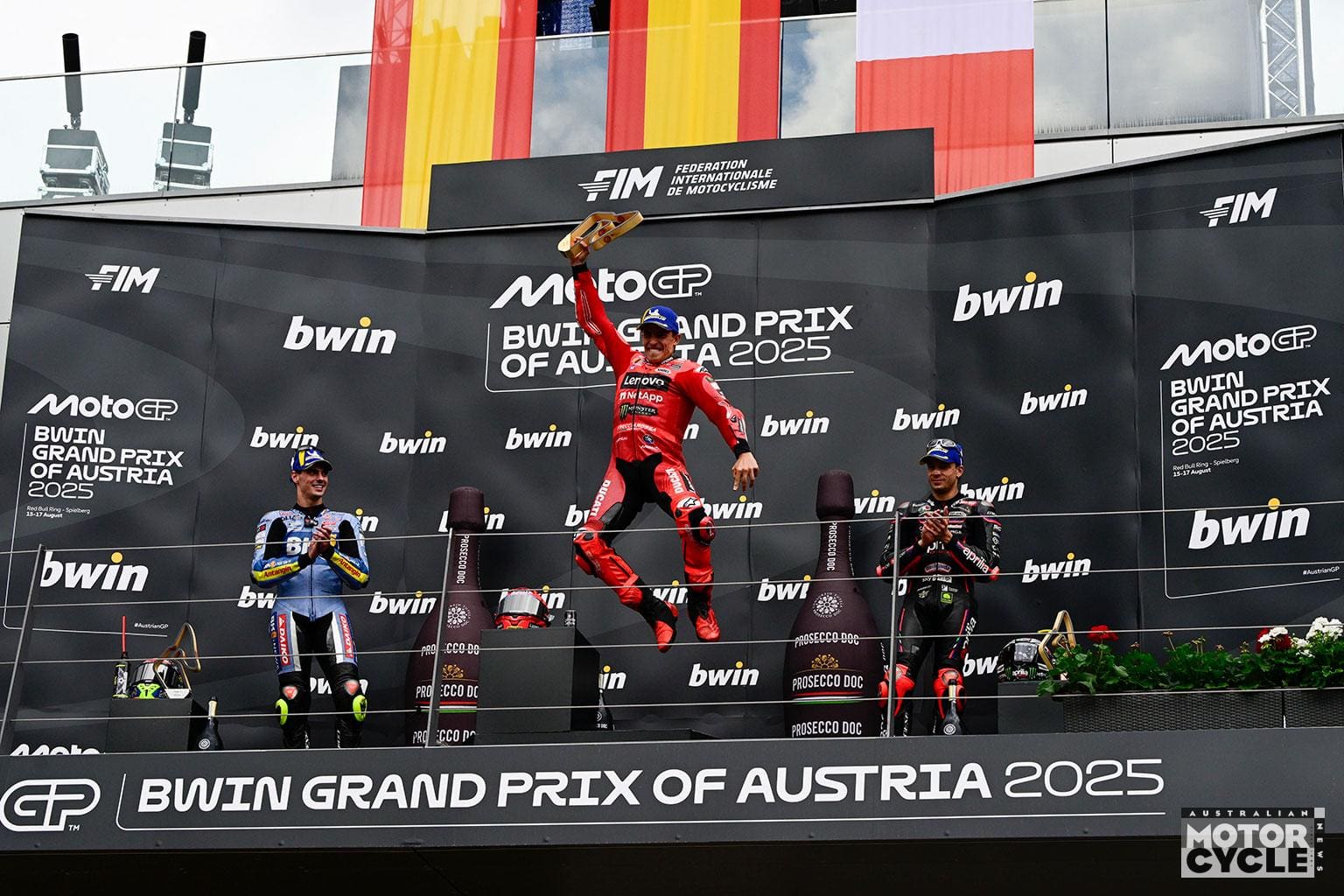 With five laps to go Aldeguer bullied by Bezzecchi into Turn 3 and set off after Marc, the gap at a neat one second. For a heartbeat it looked like Spielberg might deny Marquez yet again, but the #93 had an answer. Marquez stamped his authority on the last lap to take the flag – waved by Agostini – one second clear of a magnificent Aldeguer, with Bezzecchi two seconds further back after leading a hefty chunk of the race. Acosta held fourth from a surging Bastianini, Mir delivered an excellent sixth for Honda – his best result since 2023, Binder bagged seventh ahead of a despondent Bagnaia, and Raul Fernandez and Alex Marquez rounded out the top ten.
