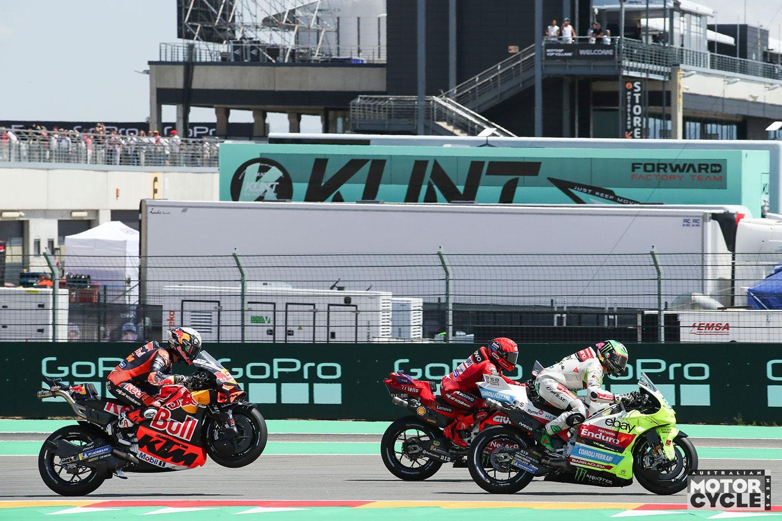 On the final lap, Morbidelli dug deep, resisting immense pressure and somehow holding off Acosta by braking impossibly late into Turn 1. Acosta again pushed hard into the flip-flop chicane but ran wide, leaving the door still ajar. Di Giannantonio stayed glued to their tails, having also benefited from the medium tyre in the final laps, yet couldn’t find a way through either.