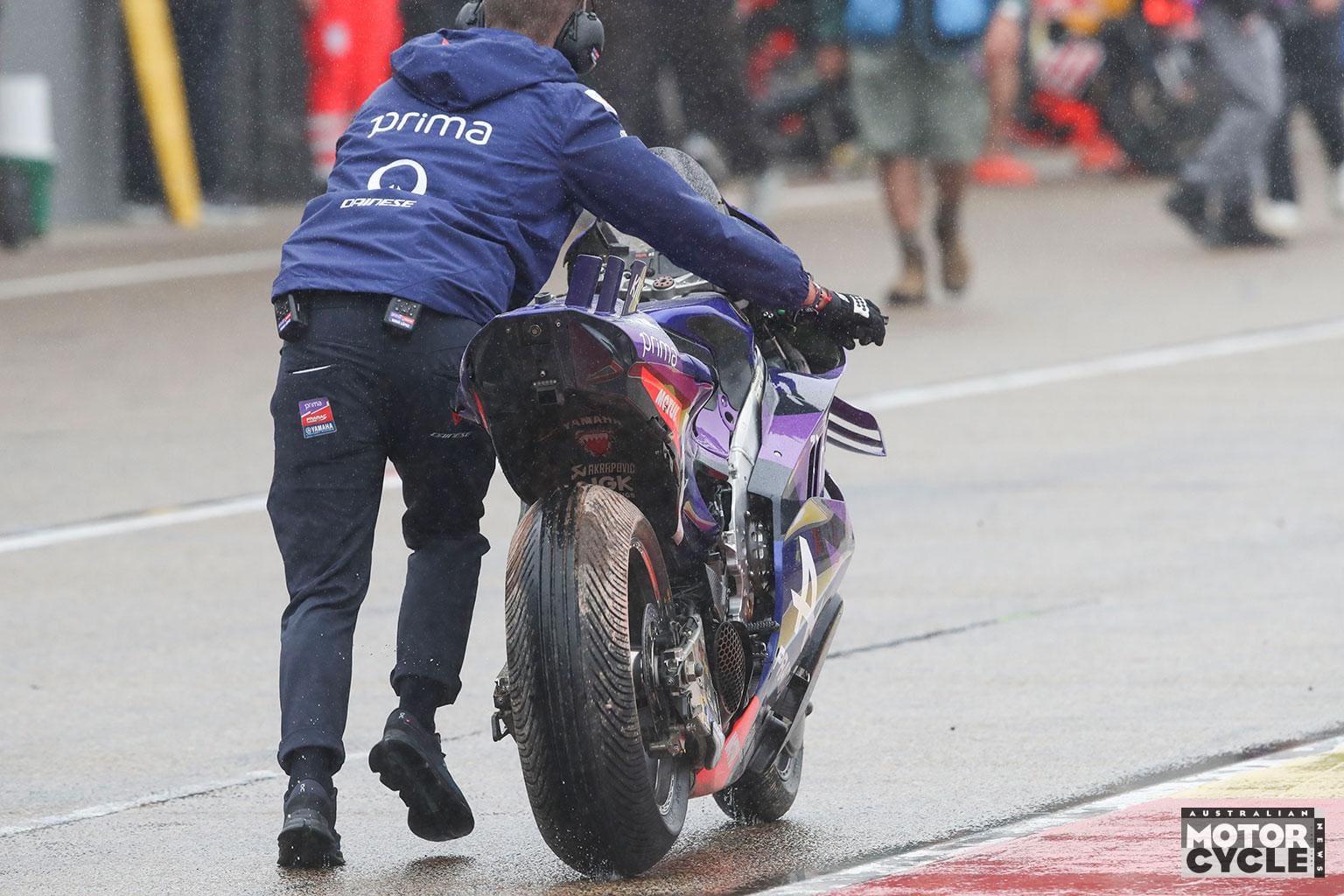 Q2 was defined by falls, unpredictability, and a drenched circuit that caught out even the most experienced names. Maverick Viñales, fresh from progressing through Q1, suffered a brutal highside at Turn 4. Moments later, Jack Miller fell victim to the exact same location, showing just how dicey that section of track was.