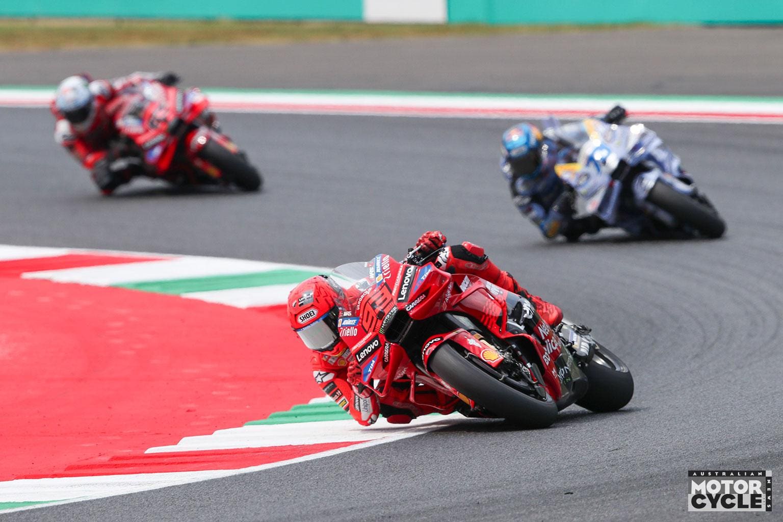 As the grid lights went out, all eyes were on Marc, but a last-minute adjustment on his handlebars just before launch left him distracted and slow off the line. Pecco Bagnaia took advantage, grabbing the holeshot into Turn 1, with Álex Márquez slotting into second while Marc dropped several positions. The first corner was chaotic as Brad Binder, having been forced wide by Fabio Di Giannantonio, collided with Johann Zarco at San Donato, eliminating both from contention.