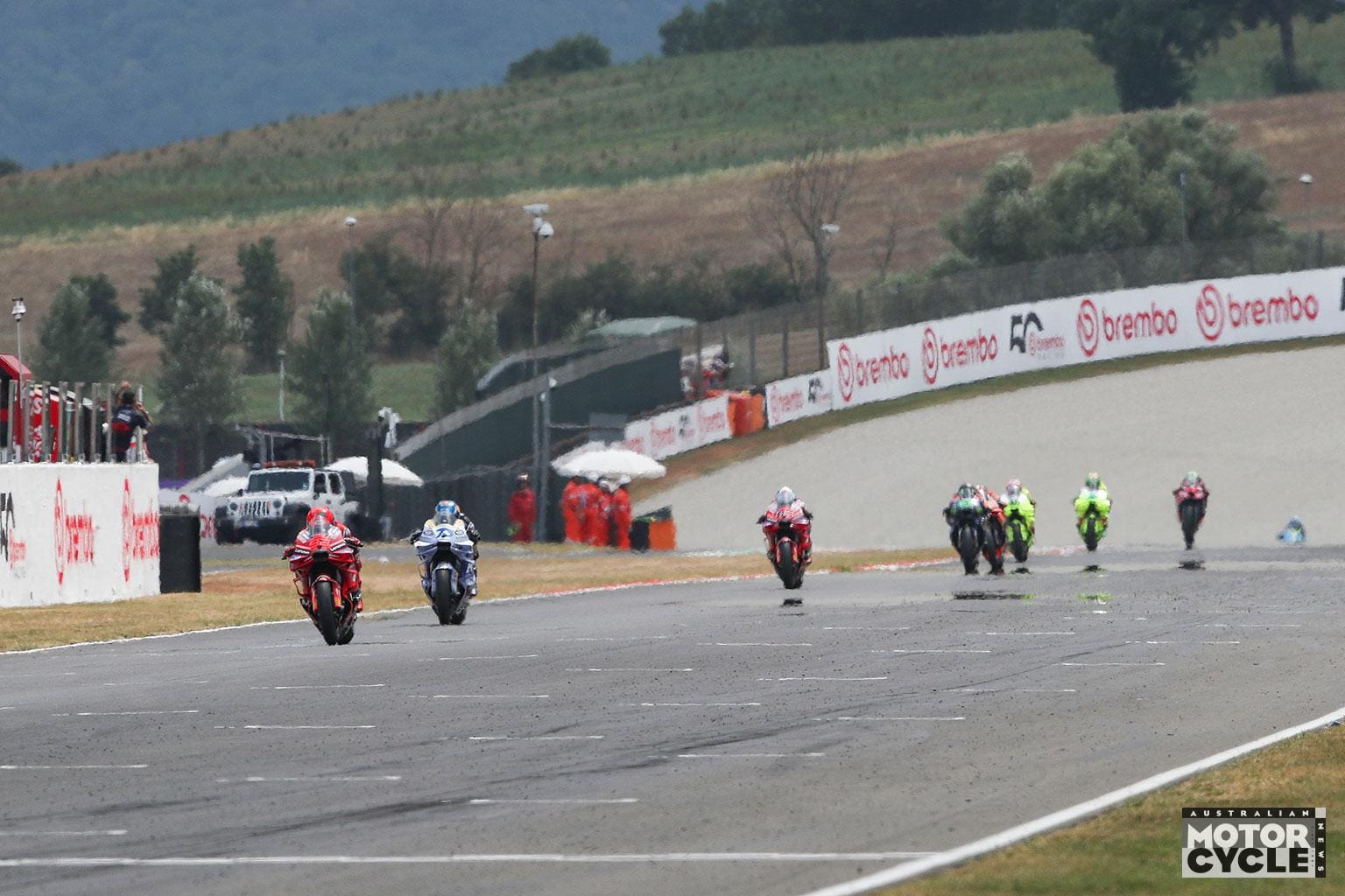 Drama struck moments later as rookie sensation Pedro Acosta ran wide and lost the front, sliding out of the race. At the front, Marc Márquez began to find his rhythm, setting the fastest lap and rapidly closing back up on his brother. Bagnaia began to lose touch with the leading pair as the two Márquez brothers edged clear. On Lap 4, Marc retook the lead with a clean move into Turn 1, setting another fastest lap for good measure. Almost simultaneously, Di Giannantonio laid down a blistering time to go fastest overall as threatening storm clouds gathered over the hills of Mugello, prompting teams to prep backup bikes for potential wet weather.