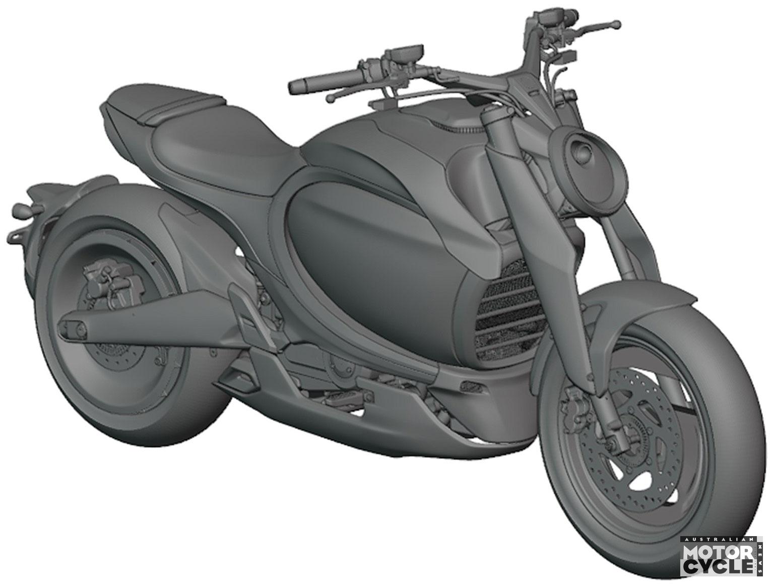 This new design patent from the company, for example, could never be said to be copying a Harley. The design takes the unusual step, particularly in the cruiser realm, of entirely covering the engine. At first glance you might even think it’s an electric bike, but there’s an exhaust tucked into the belly and an engine of unknown size and configuration hiding behind the panels that cover each side.