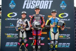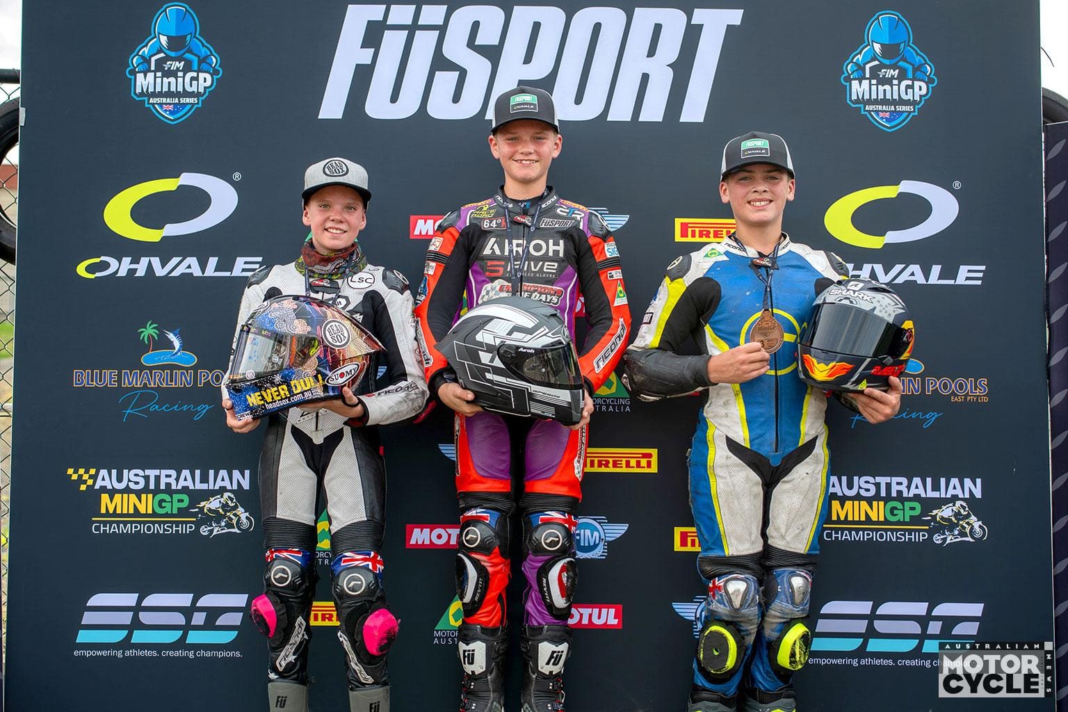2025-FuSport-FIMMiniGP-Aus-Rnd2-RbMotoLens-RML_7675-R2-Race-Podium-MiniGP-190-Jake-PAIGE-Judd-Plaisted-Phoenix-OBrien