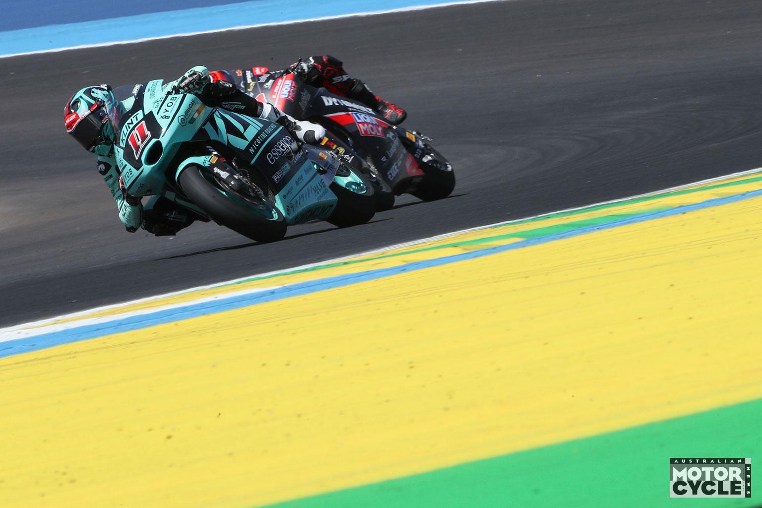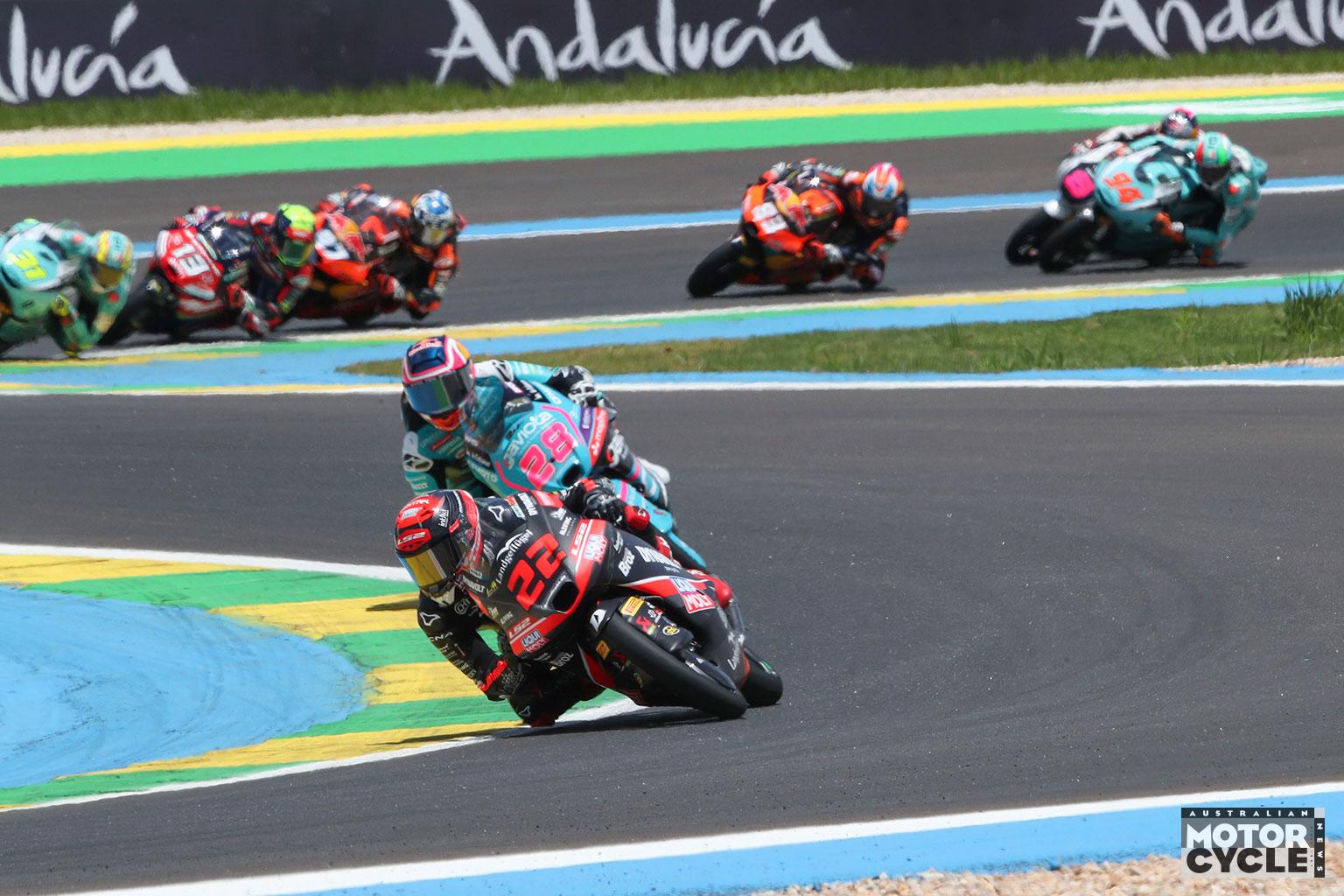 By lap six the leading group of Holgado, Muñoz, Escrig, Alonso and Manuel Gonzalez had broken clear. Gonzalez then moved past Alonso to take fourth, while Alonso continued to slide and fell into a scrap with Izan Guevara and Tony Arbolino as the front three began to form their own contest. With the laps ticking down, Gonzalez started to close on Escrig for the final podium place.