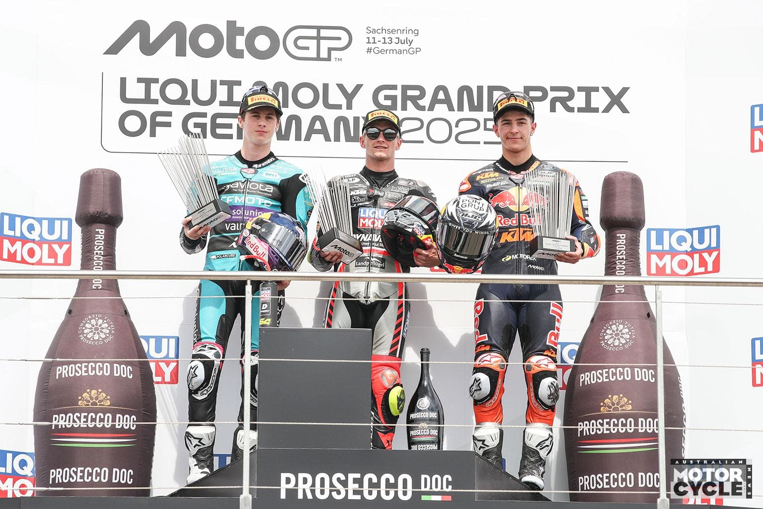 Muñoz was never going to die wondering and dived beneath Rueda at the final left-hander, with Quiles taking advantage to barge past as well, leaving Rueda the final podium spot as consolation as Muñoz swept across the line to take his second victory in the last three races.
