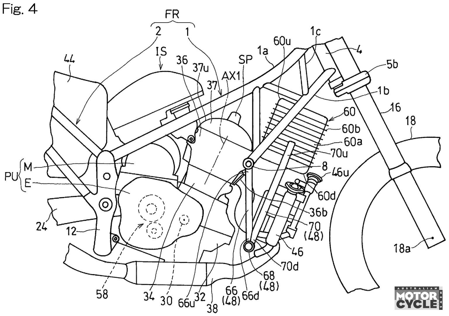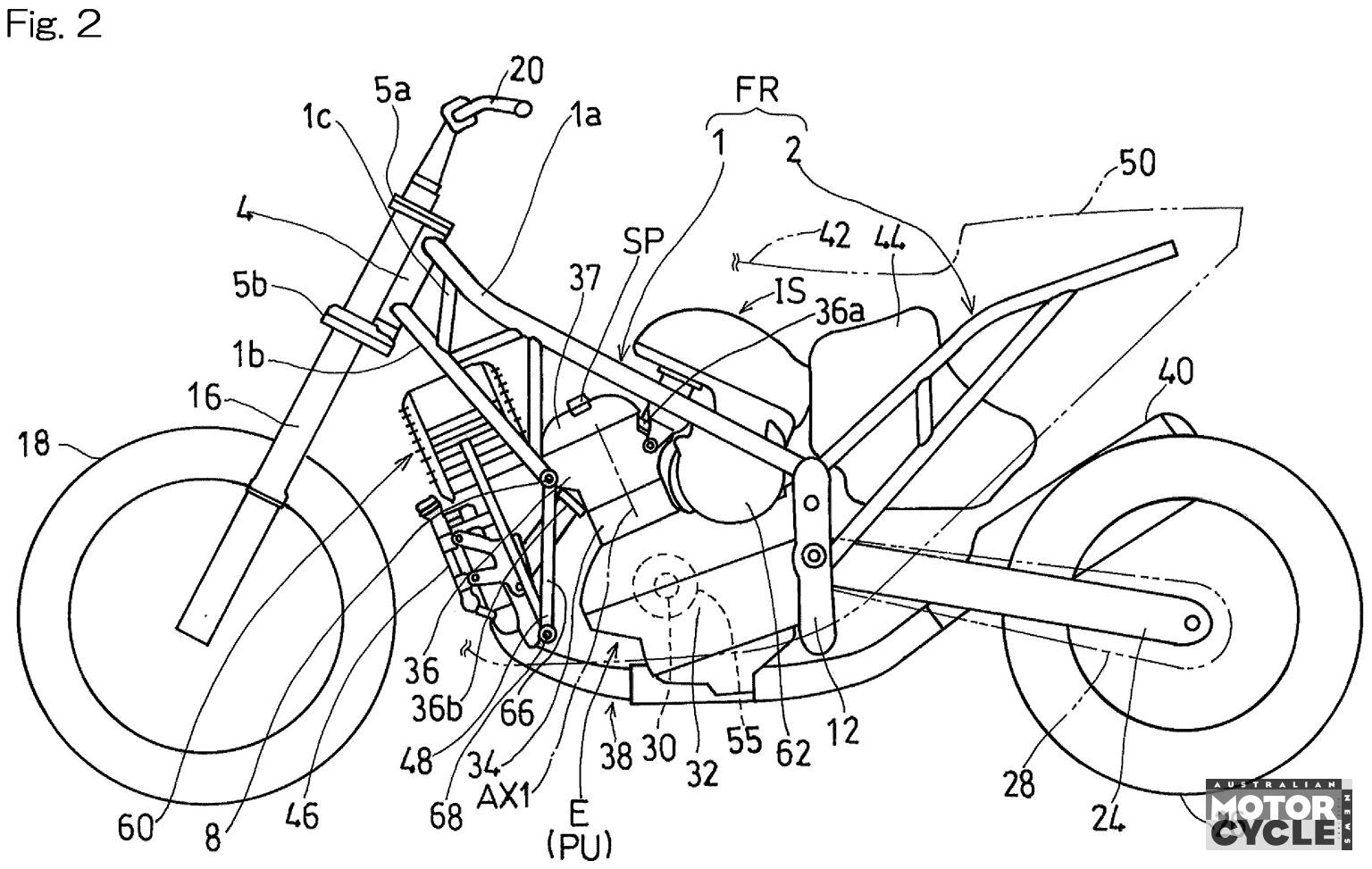 The patents show how the under-seat fuel tank has an arc-shaped bite taken from its upper rear corner, clearly intended to make space for a helmet in the under-seat storage area behind it, and the patent images show footboards running all the way from below the swingarm pivot to the front edge of the radiator, allowing a scooter-style, feet-forward riding position.