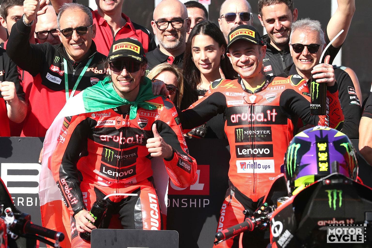 Alvaro Bautista (Aruba.it Racing – Ducati) was the runner-up in the race and joined his tall team-mate to wave their respective national lags for a celebration photo at T4 on the slow-down lap.