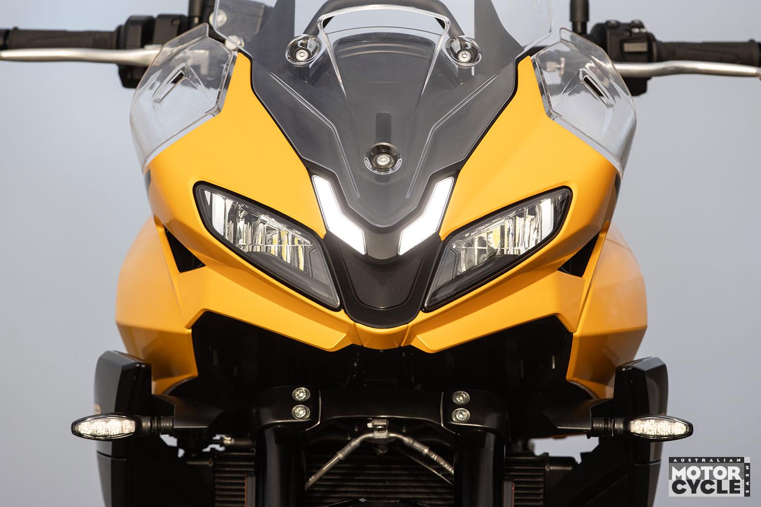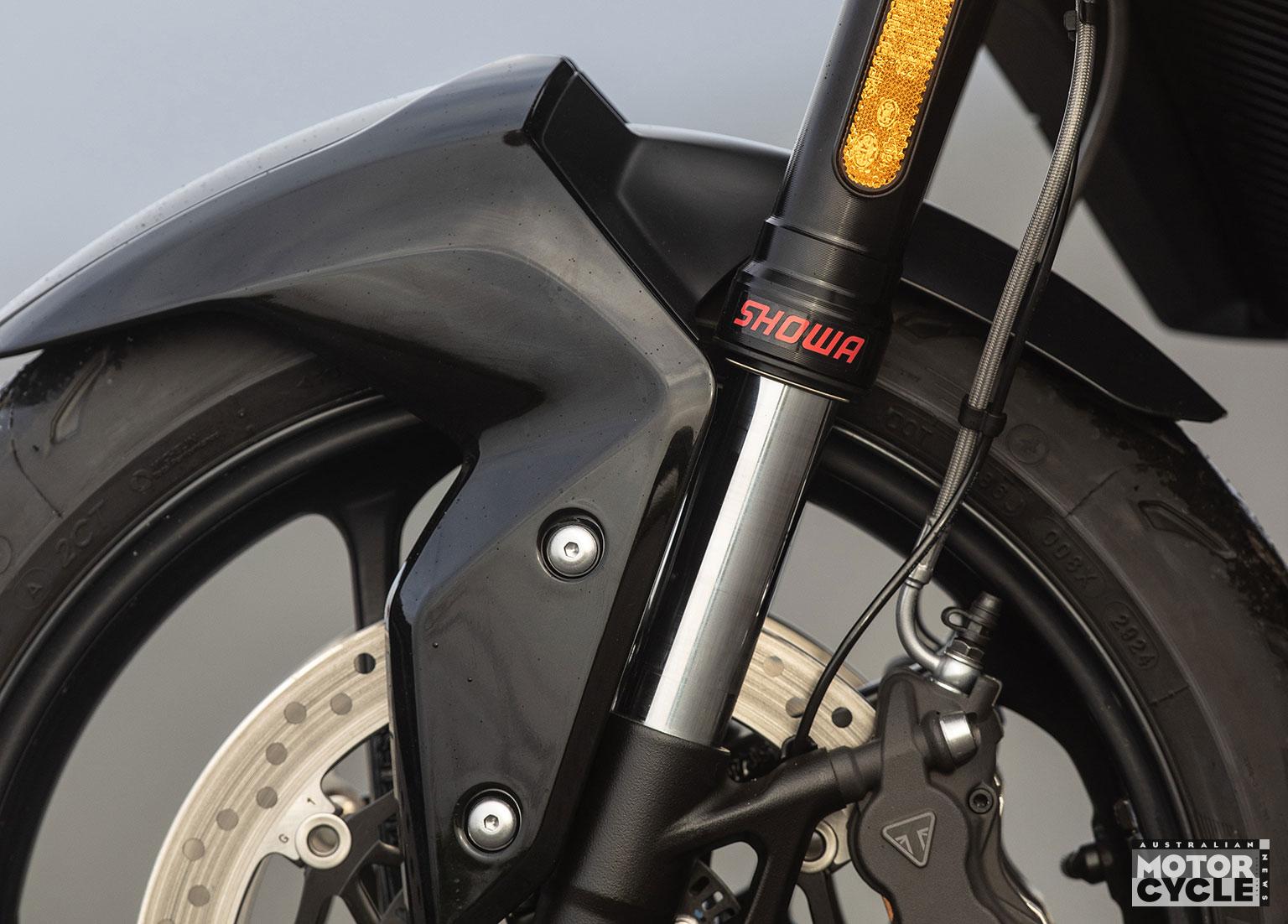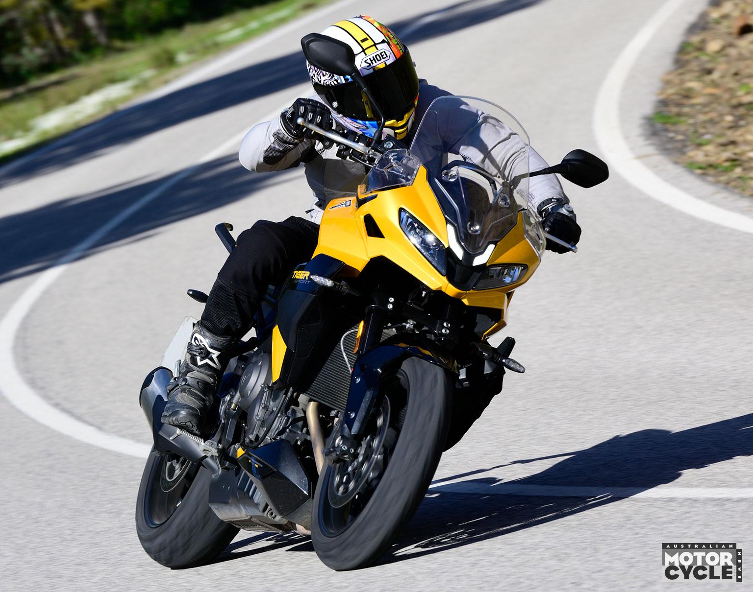 In the early morning sunlight, on smaller rims and in optional Cosmic Yellow, the Tiger looked purposeful; for under $20k it’s a great-looking bike. Even if you remove the badges, it’s clearly a Triumph.