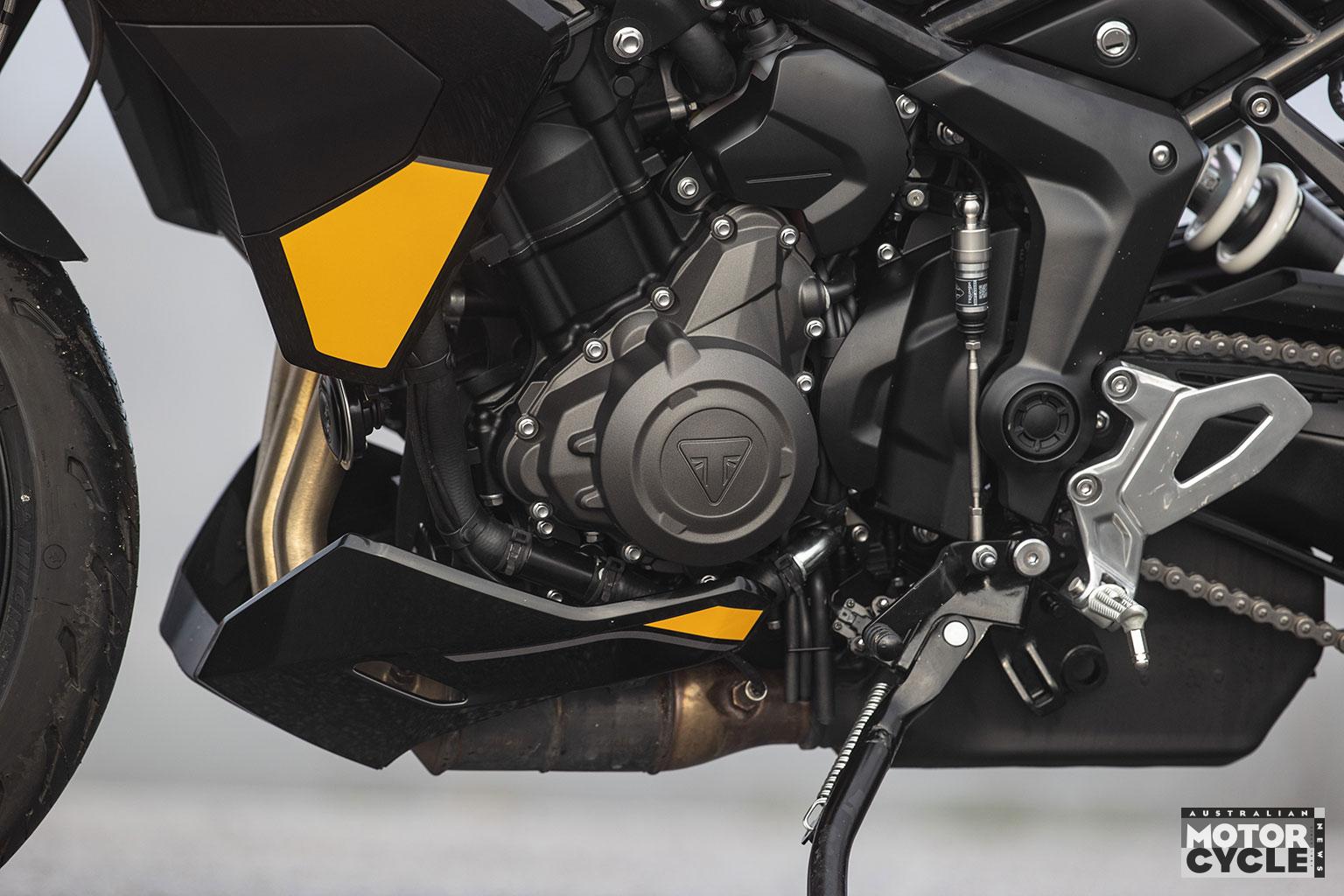 798cc water-cooled inline triple, 4 valves per cylinder, 78mm x 55.7mm bore/stroke, 13.2:1 compression, wet multiplate clutch, six-speed quickshifter, chain final drive