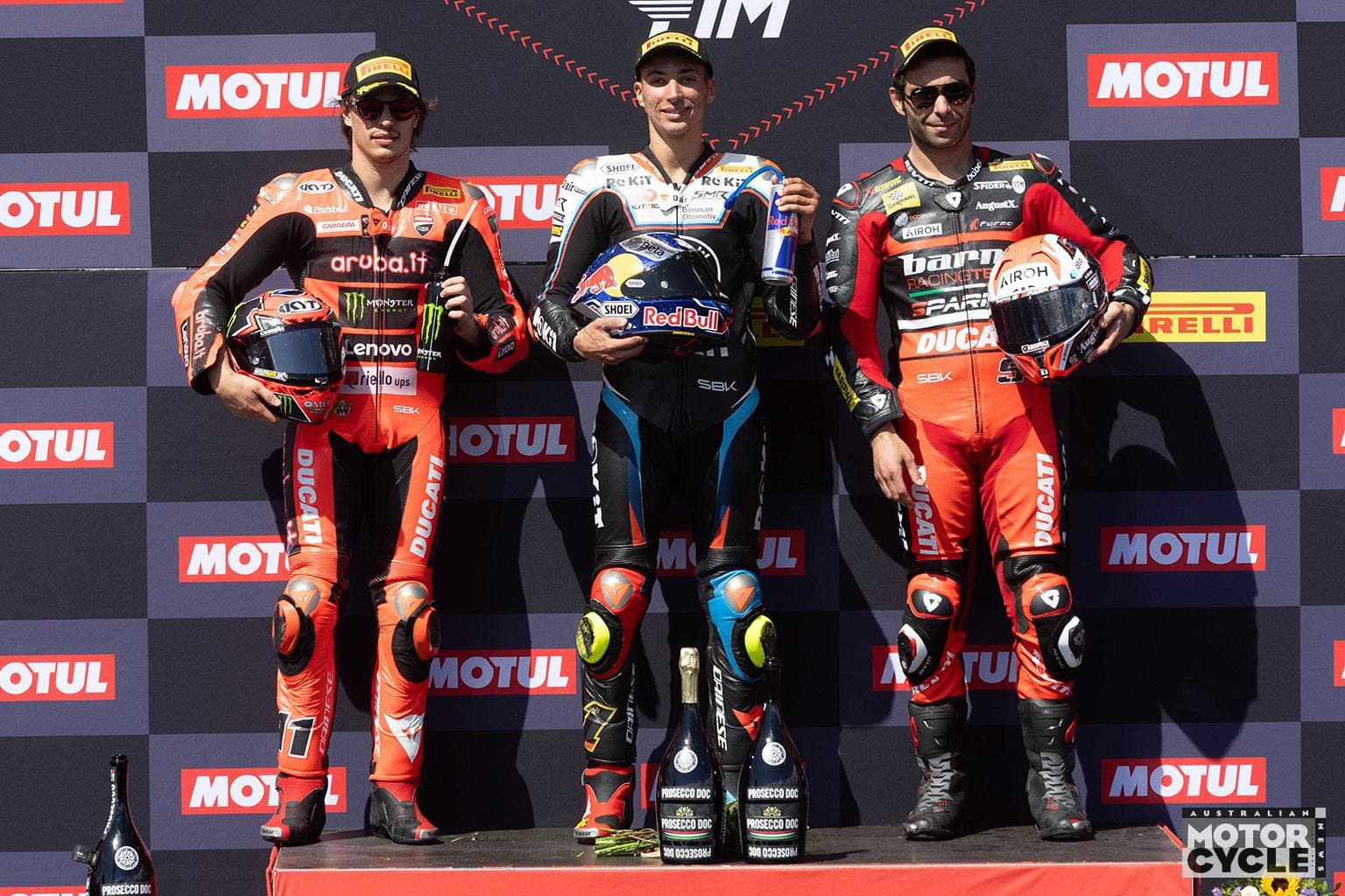 Danilo Petrucci (Barni Spark Racing Team Ducati) placed third, some ten seconds back from the winning pace of BMW’s reigning World Champion.