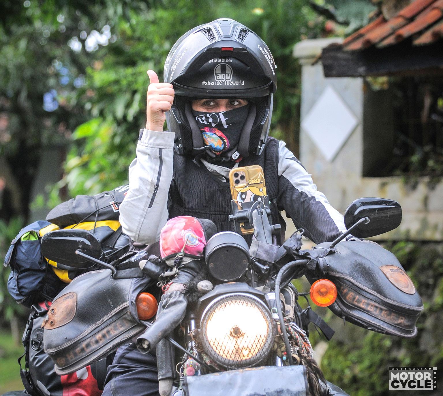 It begs the question: who commits to a life entirely on the road, trusting that a free place to sleep, a warm meal and a safe path forward will reveal themselves one day at a time? It’s when I quiz her on deciding to live on a bike that has what must be one of the smallest fuel tank capacities of any production motorcycle, that her determination – and ultimately her success so far – becomes crystal clear.
