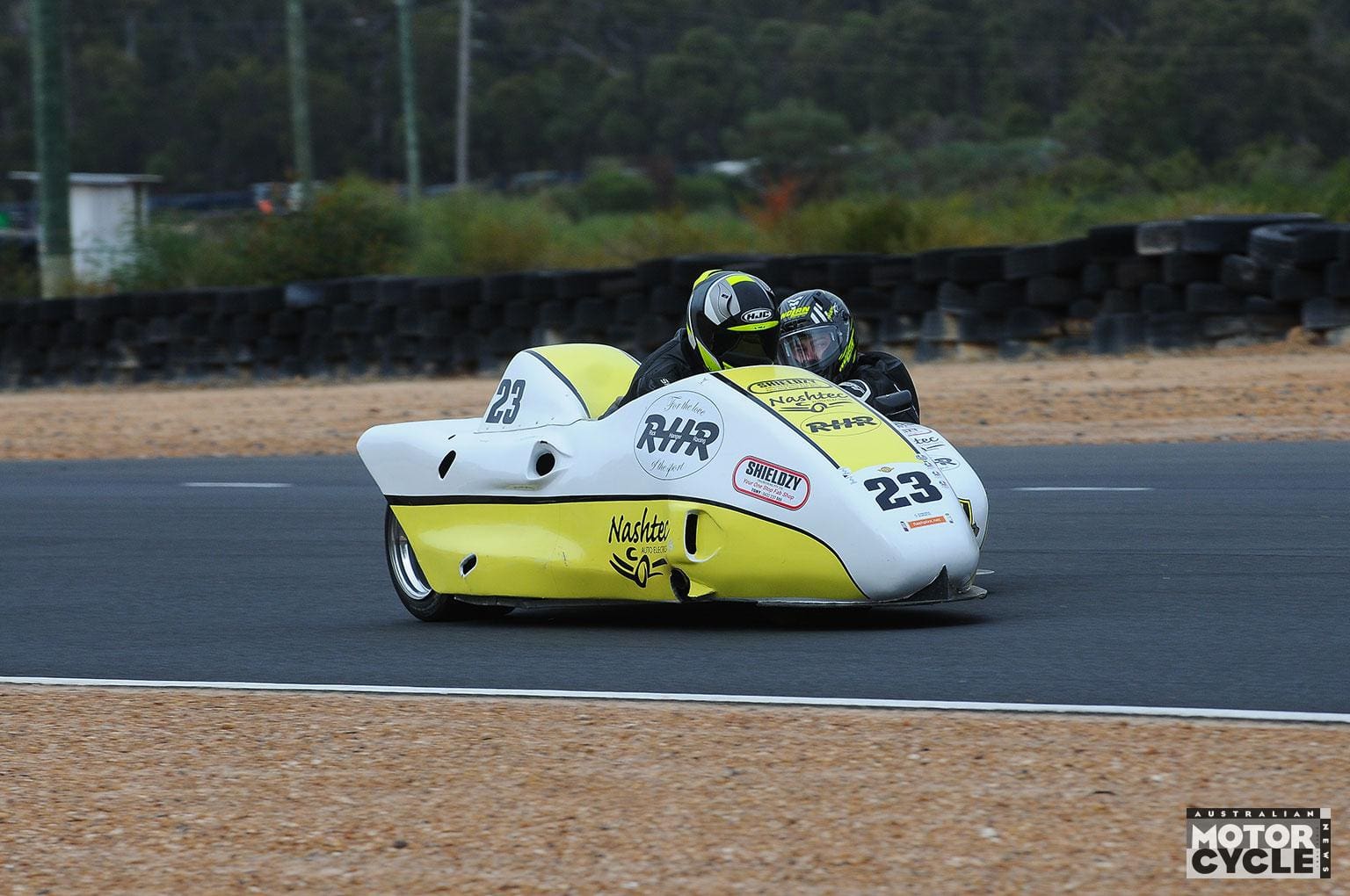 The flashpixx.net Sidecar Championship saw Darren Nash/Cooper Mapstone (RHR Kawasaki ZX-10R) untroubled in their two races taking comfortable wins. Murray Stronach/Darryl McLeod (Turnapart Engineering Suzuki 1000) took second in the first race and third in the second, with Morgan Marshall/Matt McLeish (City Panel Truck Repairs Kawasaki ZX-10R) third in the first race and second in the second race. Best of the F2 class were Steven McQueen/Max Perrin (Coppin Road Customs Watson F2) with outright fourth place on the day. Nash/Mapstone took the round win with 50 points, second were Marshall/McLeish with 38 points tied with Stronach/McLeod, McQueen/Perrin fourth with 32 points.