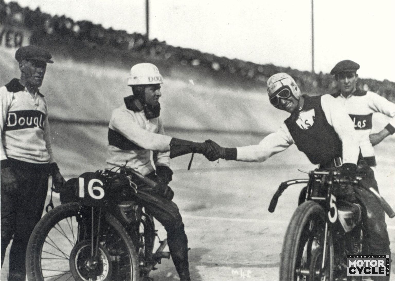 Although some reports differ, Melbourne’s Sun-News Pictorial – which featured the inaugural meeting with a full front page – stated that the Americans failed to win a race; Charlie Disney on Indian and Ron Hipwell on Douglas taking a 1-2 for the Aussies in the final, with Hipwell besting Davis in the seven-lap scratch race.