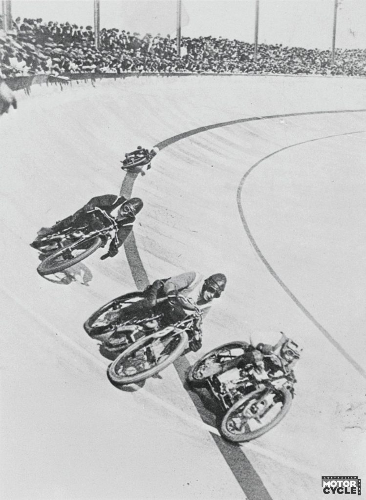 Motordrome designer Jack Prince had predicted speeds of up to 70mph (112km/h) but Charlie Disney’s Indian was timed – on a very sophisticated stopwatch – at 83⅓mph for the 629 yard circuit. Clearly the pace could only increase, and – at speeds of more than 135km/h – it became obvious that, due to tyre compression, the heavy V-twins were unsuited to the steep banking. From the second meeting the solos were restricted to 500cc.
