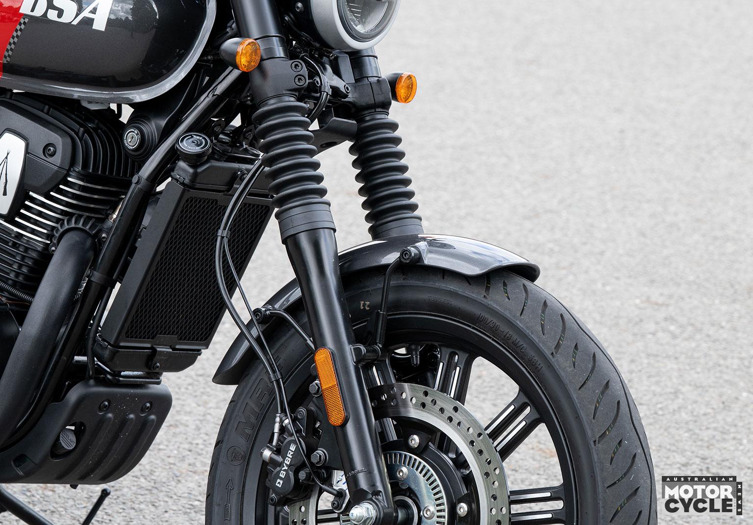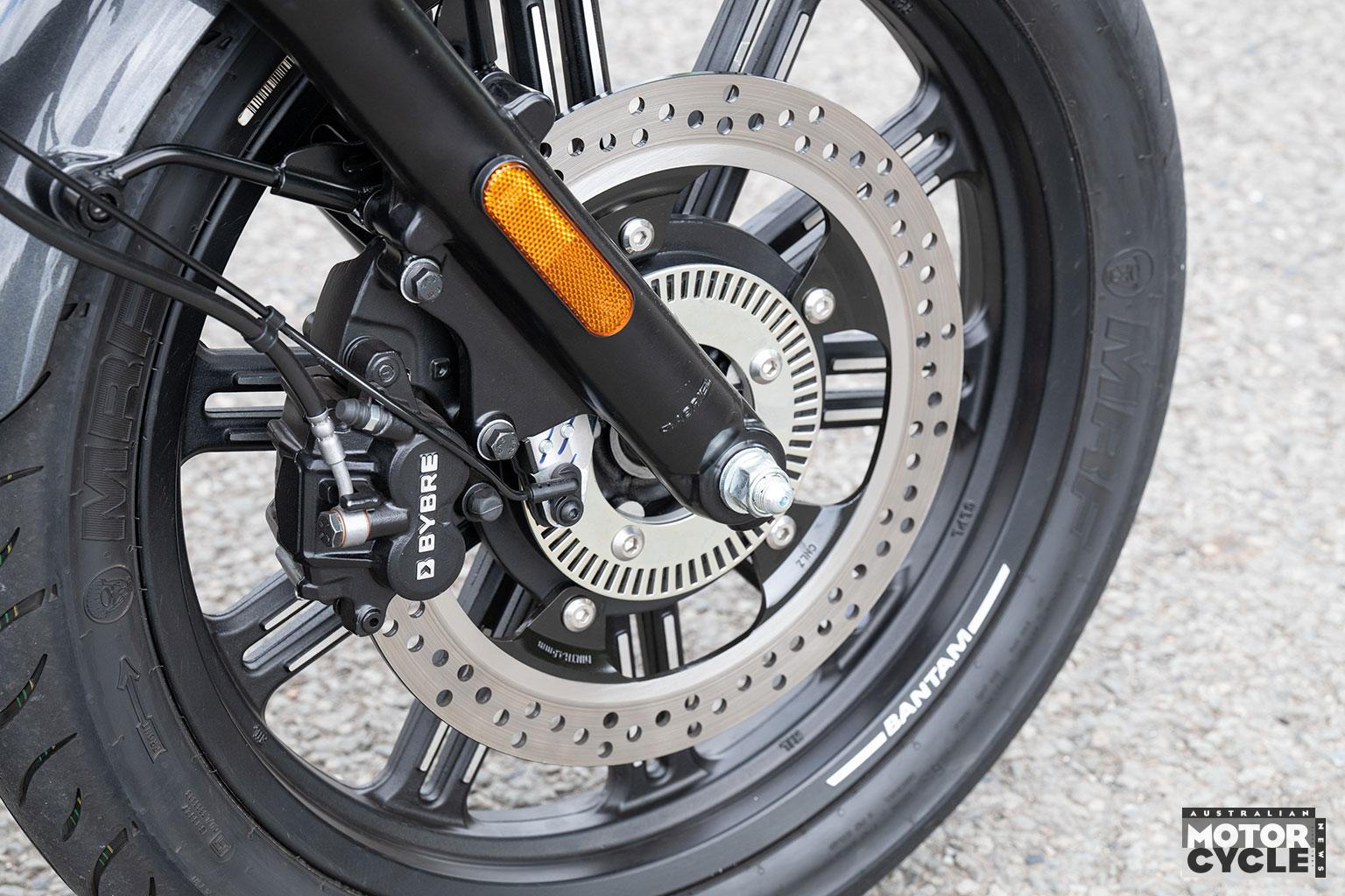 There’s a single Bybre disc brake at each end from Brembo’s Indian subsidiary, with a 320mm front rotor and 240mm rear, each with a floating twin-piston caliper and fitted with dual-channel Continental ABS.