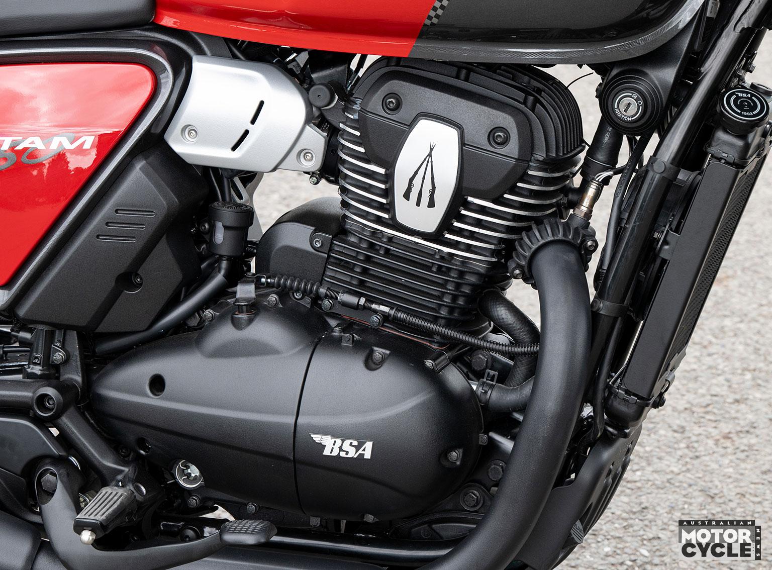 As what’s certain to be only the first of several different variants on the same platform, in retailing at £3499 ($A7302) in the UK plus £215 OTR (on the road) charges and including a three-year unlimited mileage warranty, the new model undercuts its direct Royal Enfield Bullet competitor by a massive £1130. Yet there’s no hint of it being built down to a price when you see the new BSA Bantam in the metal. Its four-valve Alpha 2 engine is taken from Classic Legends’ existing Jawa and Yezdi models sold at present only in India (plus the Czech Rep. for Jawa models via the lease of that name), and is a considerable step up in terms of design and performance versus the opposition. So the BSA’s Euro 5+ compliant oversquare 334cc single-cylinder engine, measuring 81mm x 65mm and with the company’s crossed rifles emblem flanking the camdrive, is a quite different proposition to its direct rivals. It’s a short-stroke design aimed at greater power.