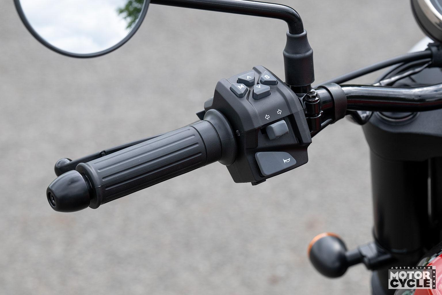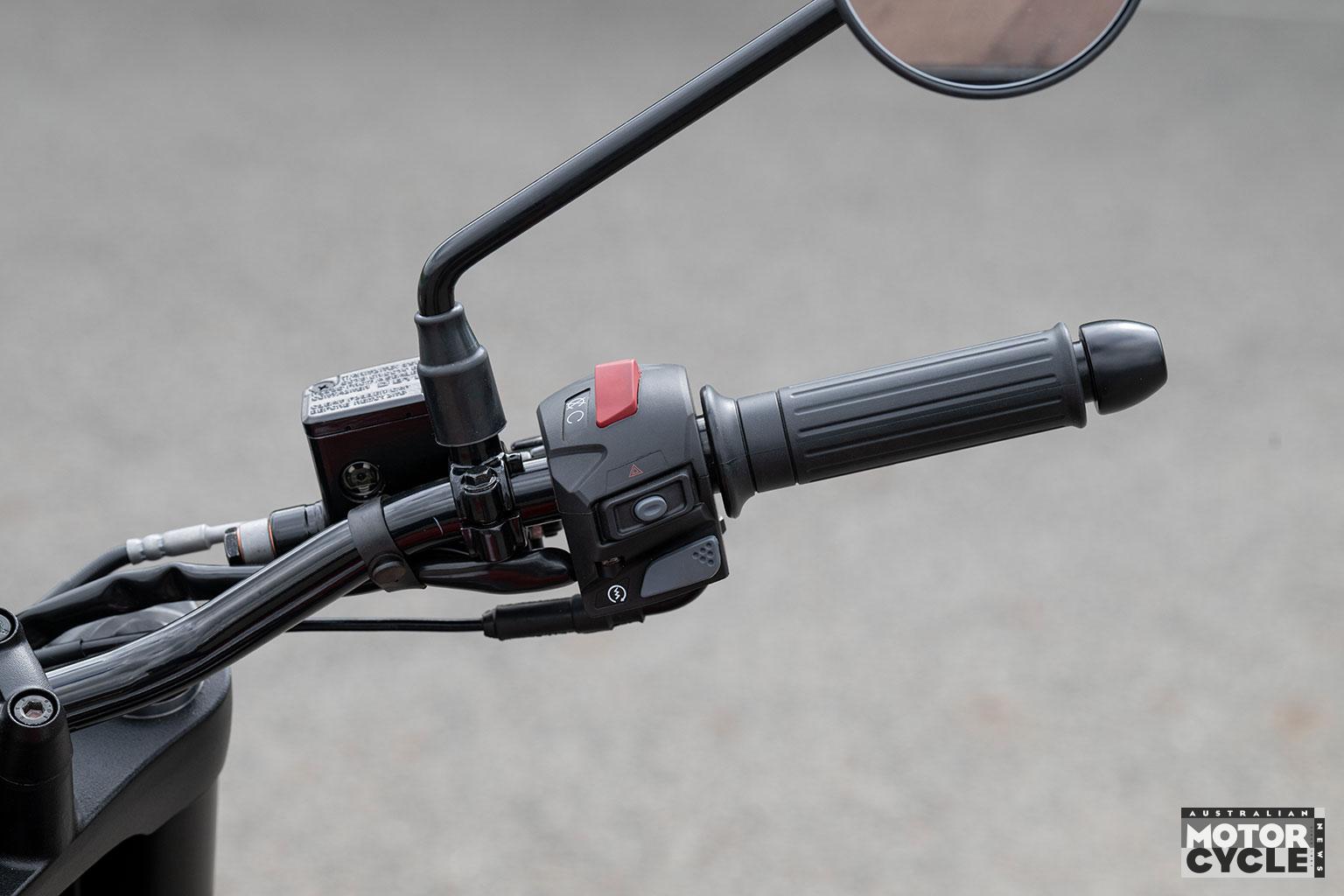 The single round LCD instrument offset slightly to the right shows speed, revs, mileage/twin trips, time, fuel and gear selected, but is mounted at such an angle that it’s hard to read in daylight thanks to reflections on its opaque glass cover. However the neutral light is satisfyingly bright and can be seen at any time. The switchgear is decent quality, and there’s LED lighting front and rear, the latter via a neat custom-style taillight.