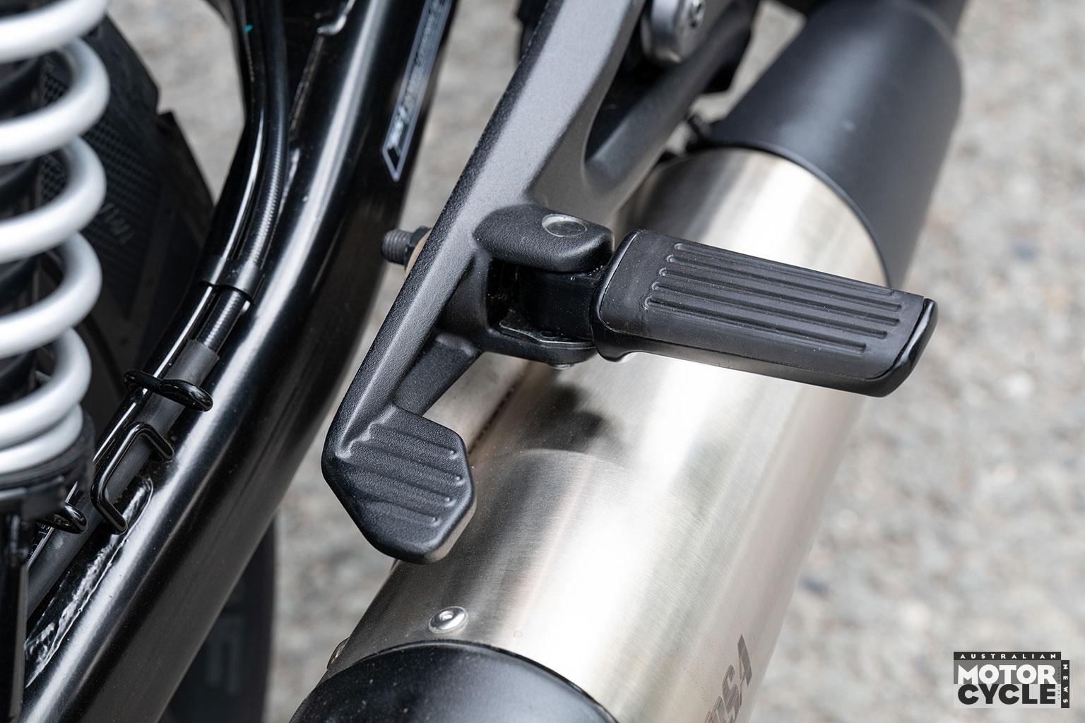 Fit and finish appear to be good; the pale silver external springs on both shocks, sports-type exhaust with the alloy-wrap silencer, short fenders and blacked-out engine give it neo-custom roadster appeal. It looks sharp, although the bland, round mirrors let it down a bit. I did like the metal pad mounted behind the right footrest to stop you treading on the exhaust silencer wrap with your heel. Very thoughtful!