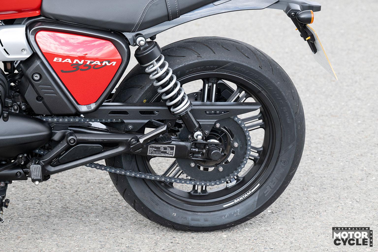 With a claimed 185kg kerb weight including a 90 per cent full 13-litre fuel tank, the Bantam scales exactly 10kg less than the RE Bullet with same size tank, so there’s surprisingly no penalty for carrying an extra camshaft, another gear ratio, a radiator and a cooling system full of water versus its main air-cooled, five-speed, SOHC rival.
