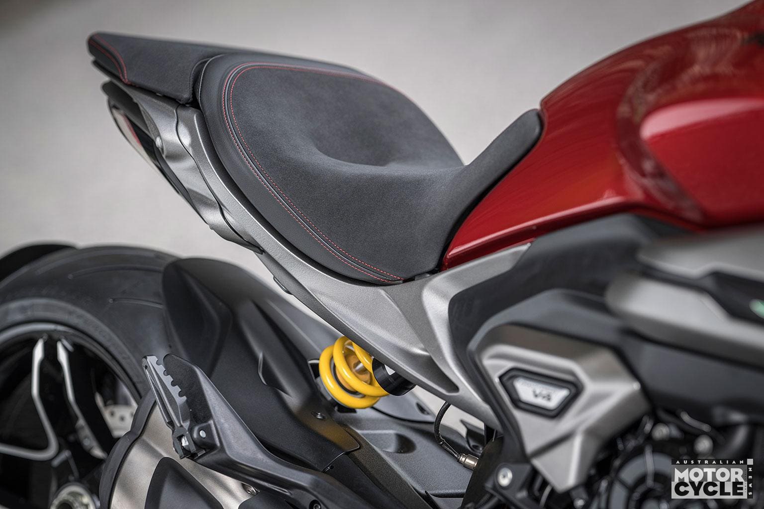 The big talking point is the introduction of the counter-rotating-crank 1158cc Granturismo V4 engine in favour of the traditional 1260 twin. Smoother, with a more free-revving linear delivery, peak power increases to 124kW (168hp) at 10,750rpm, but peak torque is a fraction down at 126Nm at 7500rpm. The V4 has wider service intervals (15,000k or every two years) and is equipped with Ducati’s rear cylinder deactivation system. This cuts the two rear cylinders at low rpm to reduce heat transfer to the rider on warm days, and save fuel in the process.