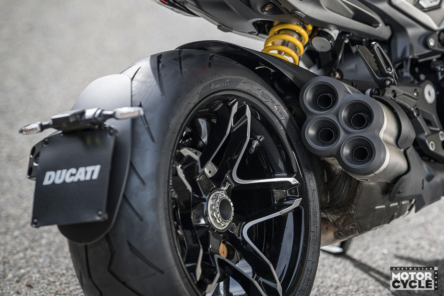 THE BASE XDiavel starts at $46,500, however, you can quickly start to add a few extras and personalise the Ducati to taste if money is no object. The optional Black Lava is an extra $400, but that’s just the start. The touring pack with semi-rigid panniers, passenger rear backrest and heated grips adds around $300. Cosmetically, coloured calipers are another $1500, and options for dashings of carbon are almost endless from clutch cover at $400 to a rear mudguard at $800. If you really want to stand out, the racing complete exhaust (track use only) is just over $10k, and lighter forged aluminium wheels around $4k. It all comes down to budget but it’s relatively easy to tick some boxes and have a $70k XDiavel should you want to.