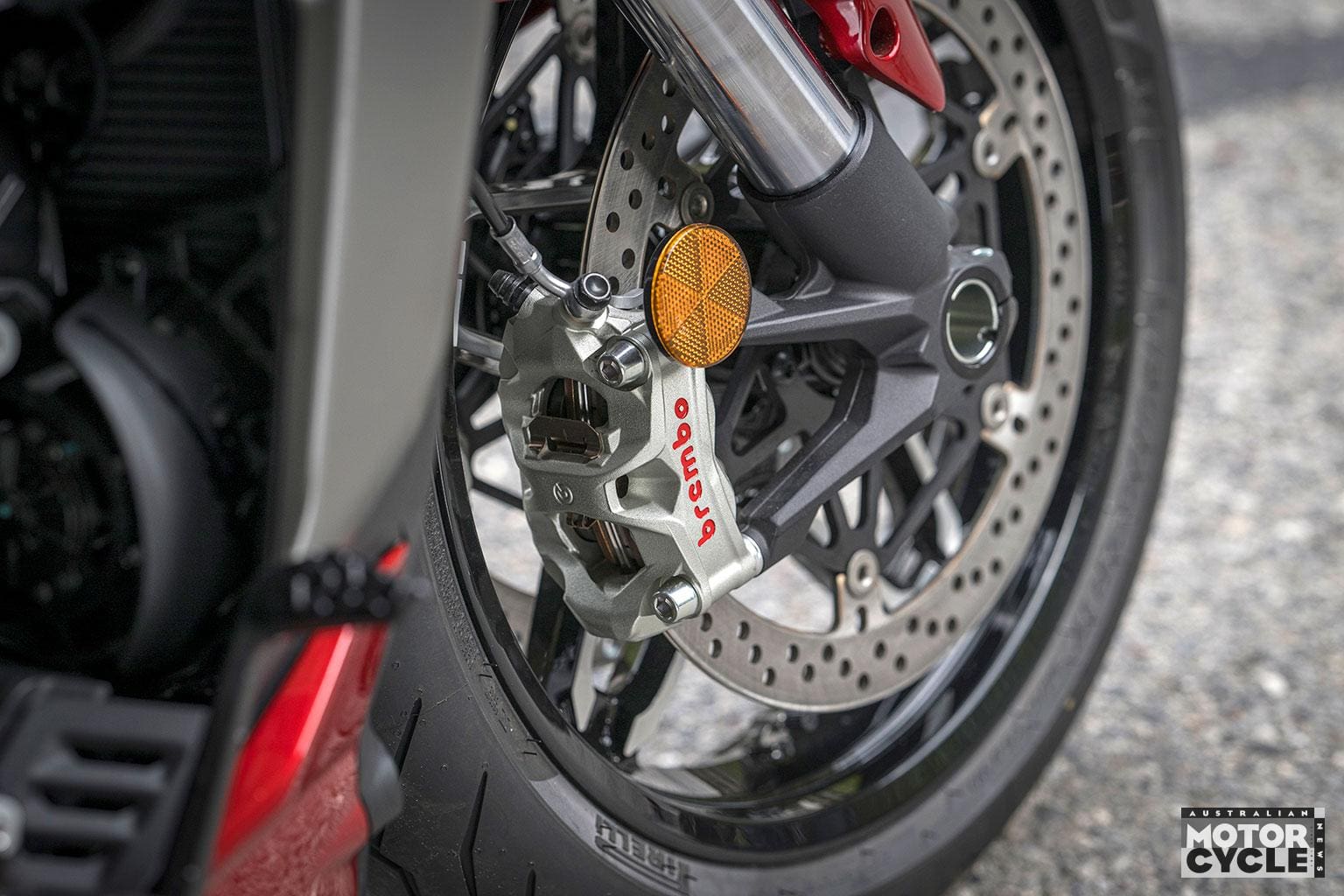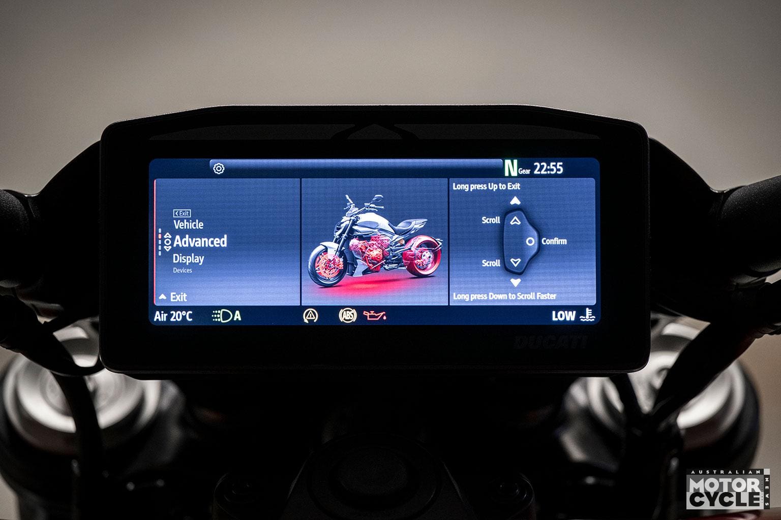 With the new engine comes a raft of new rider aids, four riding modes (Sport, Touring, Urban and Wet), along with three power modes (High, Medium and Low). Ducati Power Launch Control, Ducati Wheelie Control, Ducati Traction Control and Cruise Control are all present and valid on a hotrod like this, and operated by a new switchgear and a generously sized new 6.9-inch dash. As you’d expect, cornering ABS is standard to match those Brembo Stylema stoppers and 330mm discs.