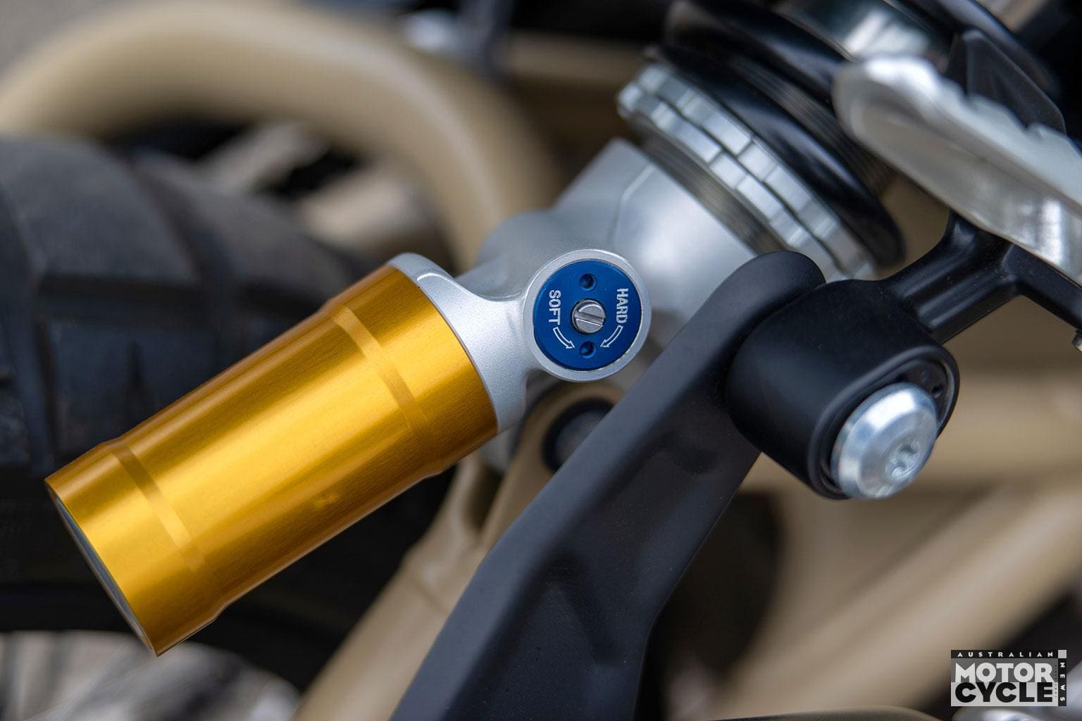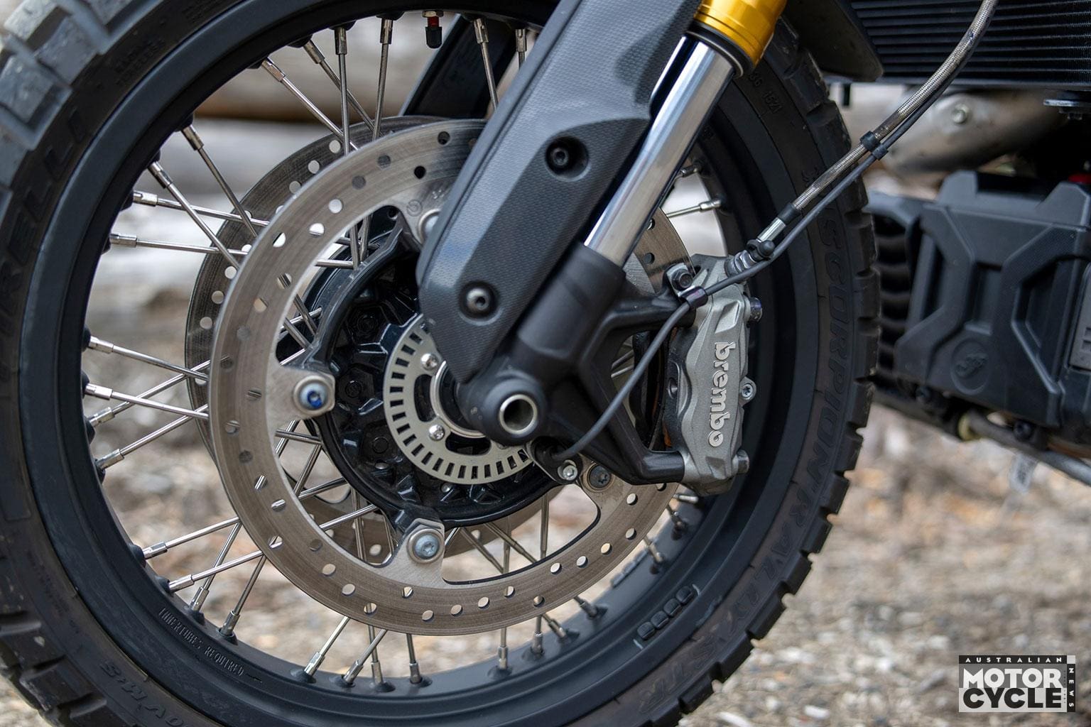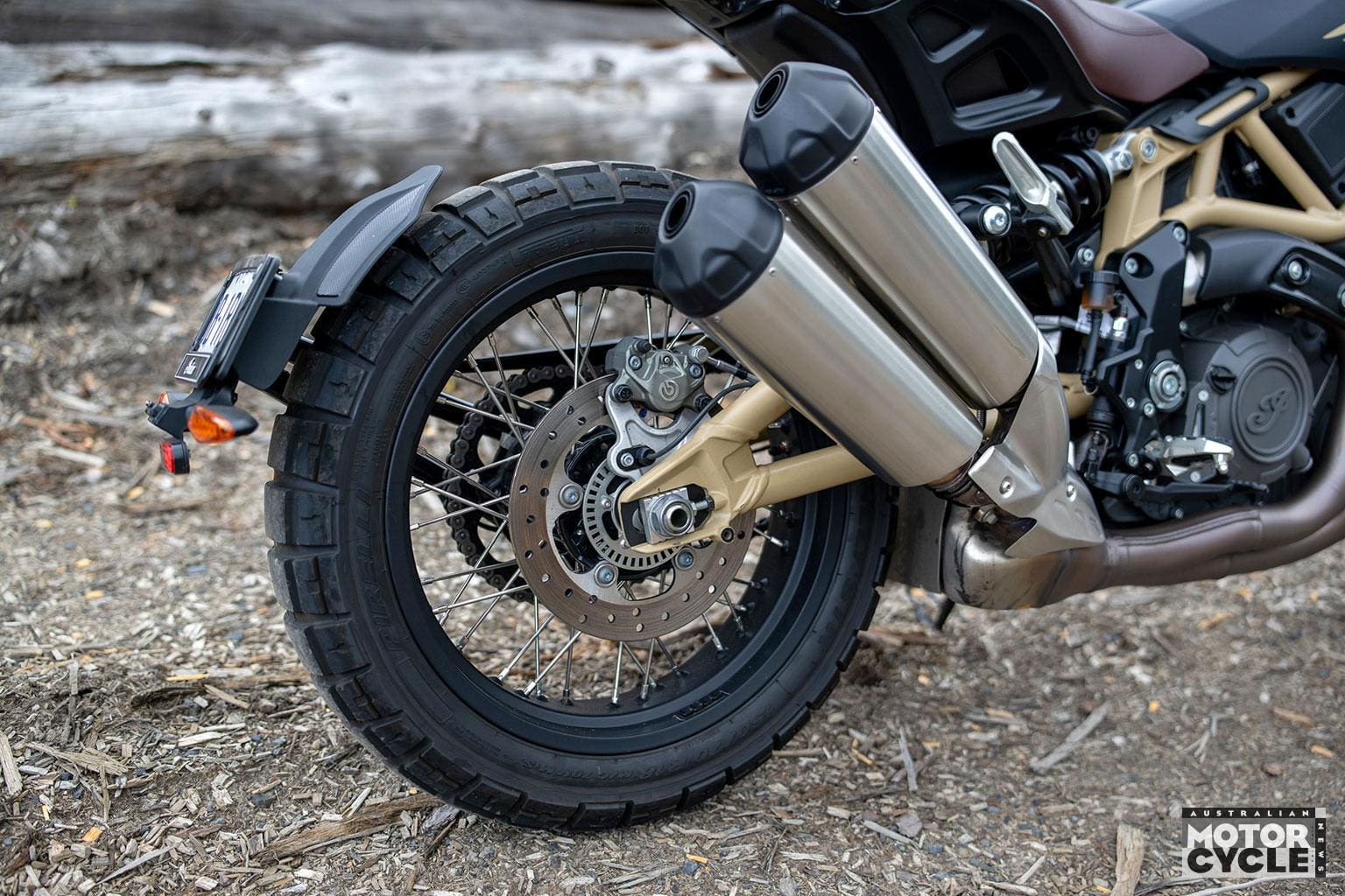 The adventure rubber limits the maximum lean to 43°, a couple of degrees less than other FTR models, but in the real world you’d be doing pretty well to access that amount of angle on a public road with knobby tyres. Edge grip becomes a limiting factor well before ground clearance, which deters you from wanting to push the front end with too much vigour lest you suddenly find your right hand is writing cheques the tyres can’t cash. That said, your mates would have to be riding their crotch-rockets pretty damn hard to leave the FTR behind, and the Brembo stoppers front and rear have tremendous modulation and bite.