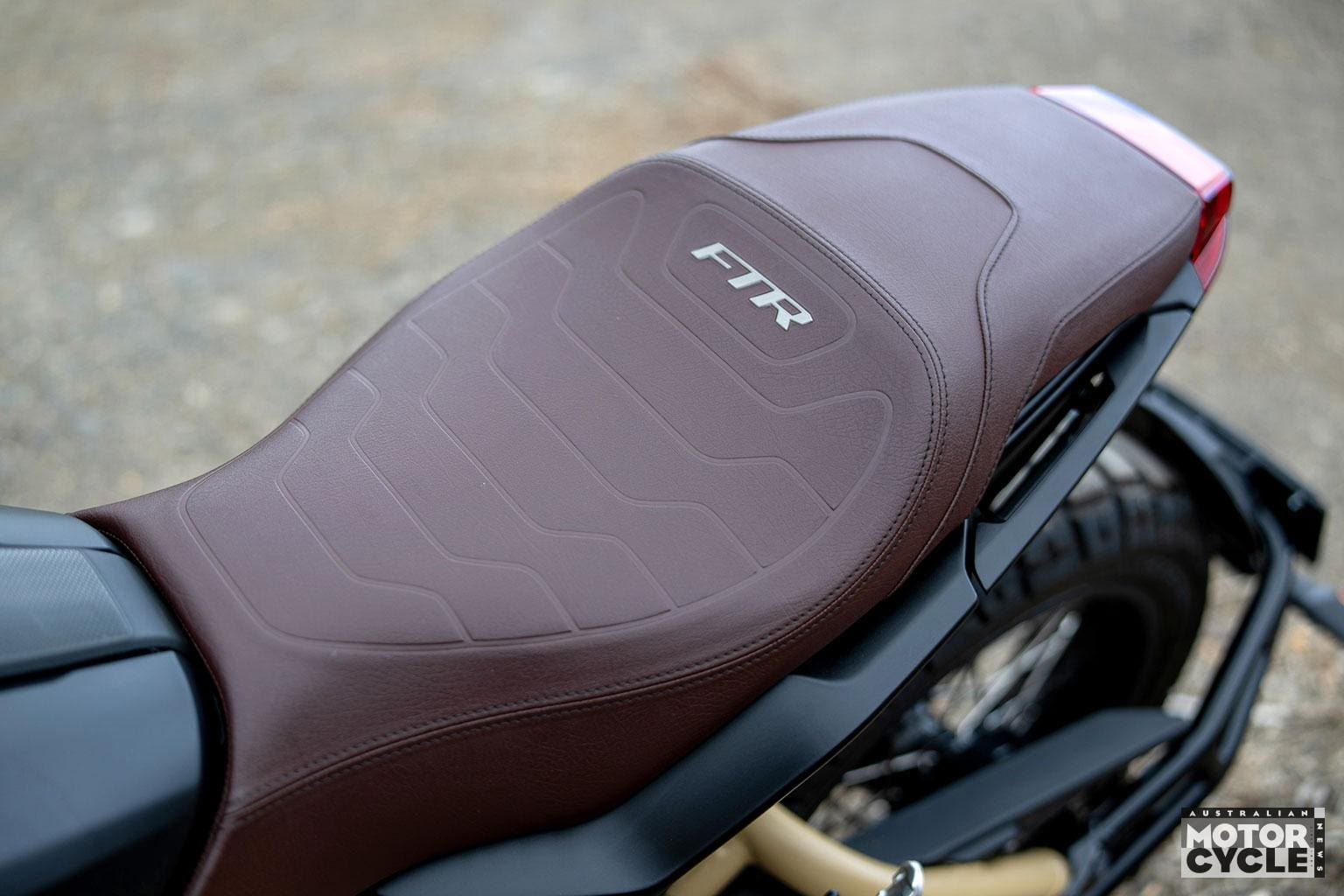 The FTR has a feature that ensures you’ll need to stop for rests every so often though – a teeny 12.9 litre fuel tank. Cylinder deactivation tech means 200km stretches between refills are achievable in normal riding, but injudicious use of the right-hand grip results in the fuel gauge falling alarmingly quickly. And let’s be honest, you don’t buy a bike like this to tootle around like you’re driving Miss Daisy.