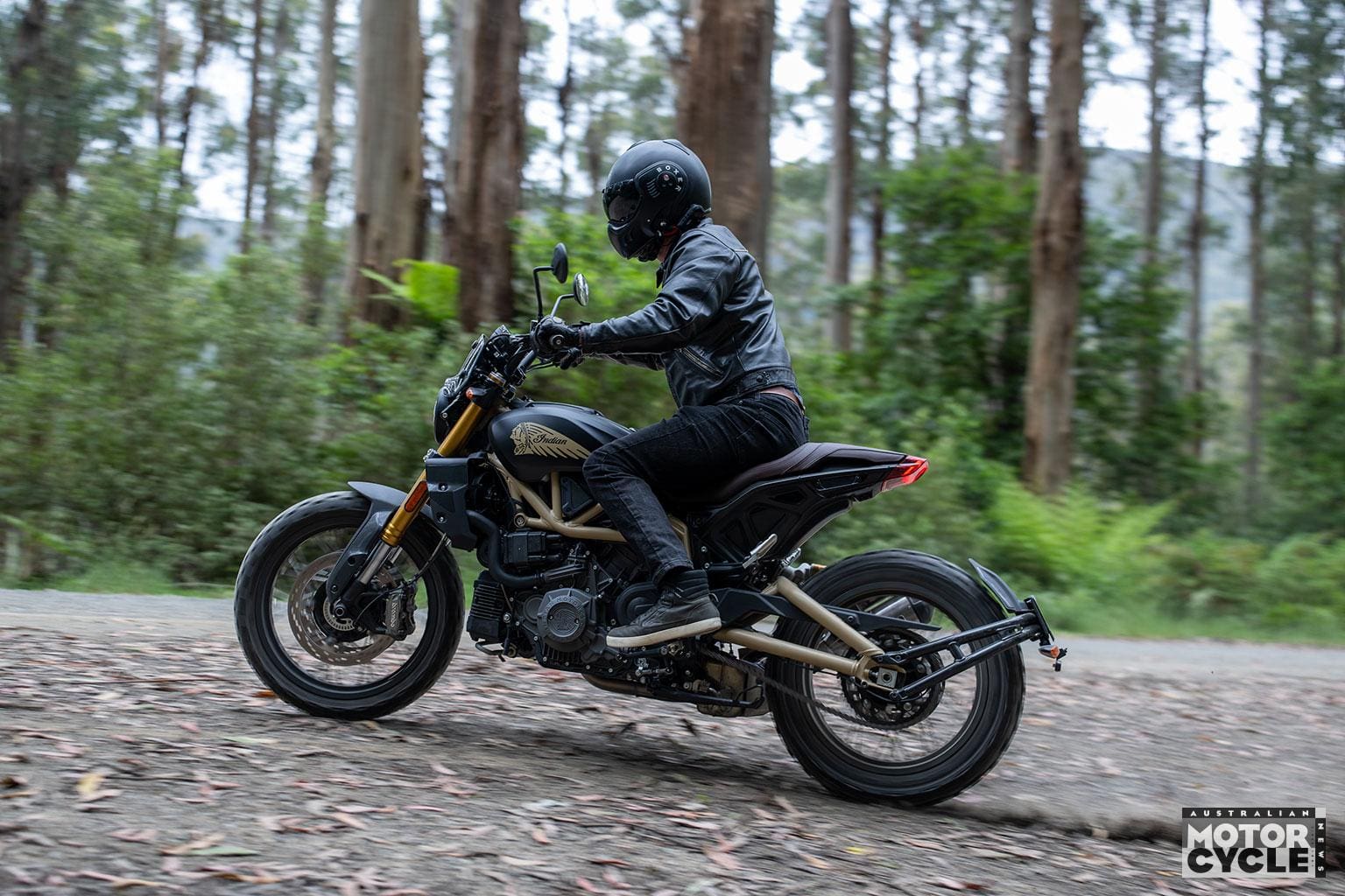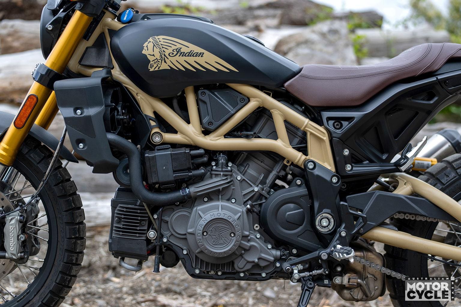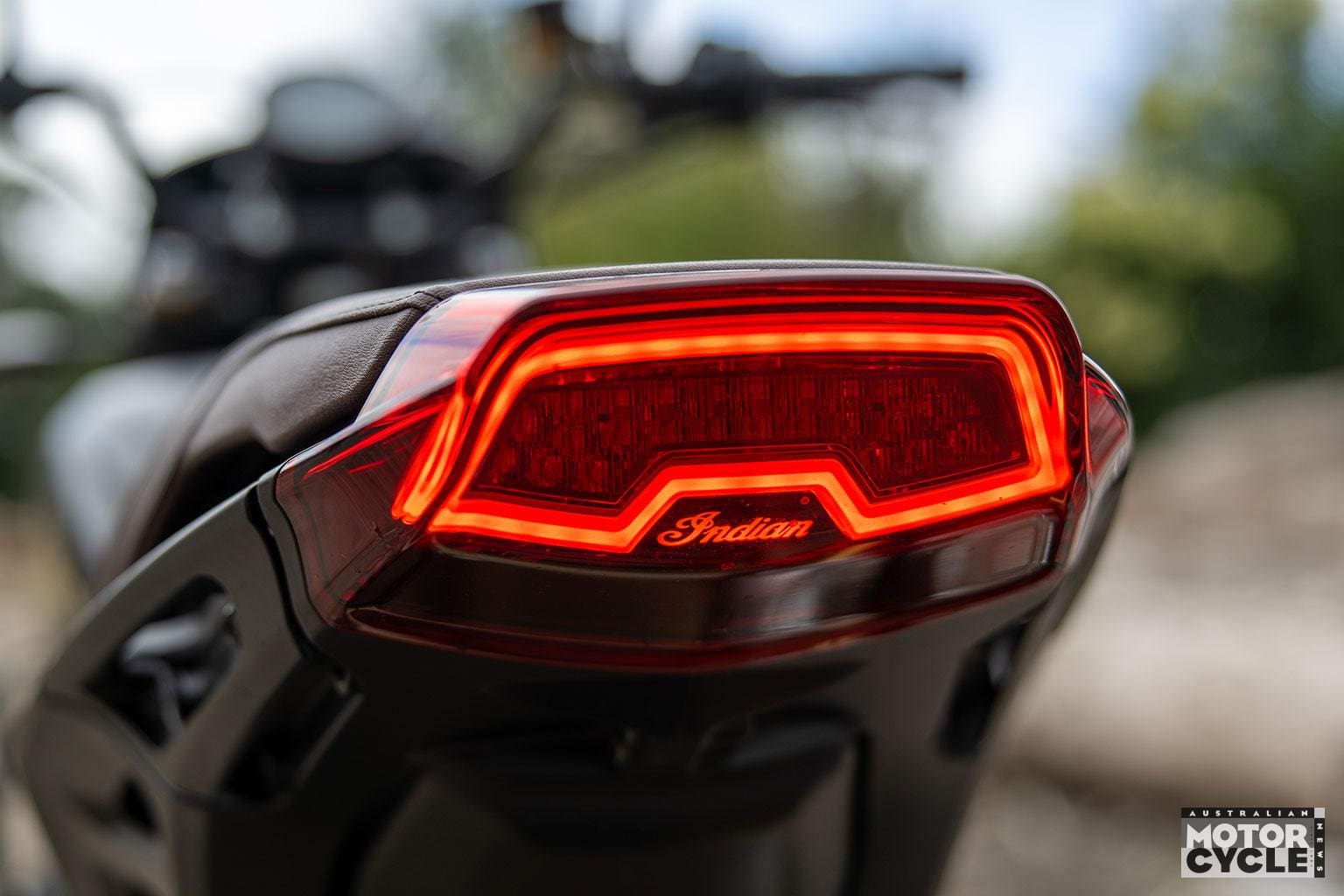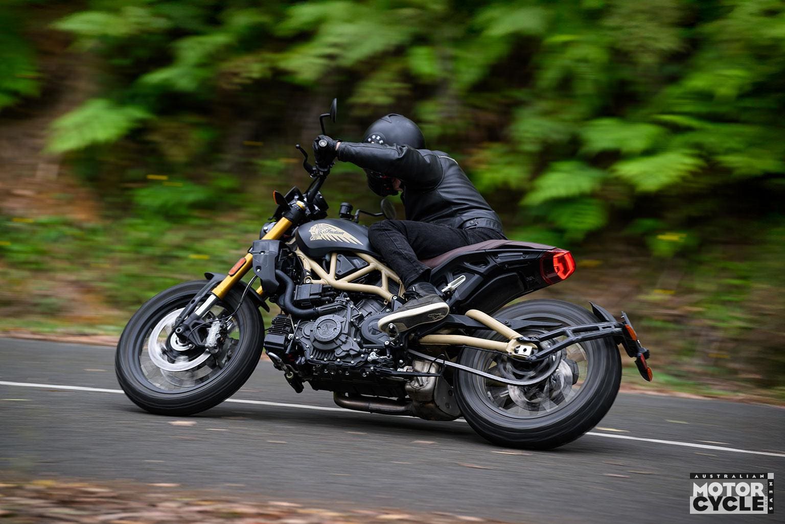 Thumb the starter with a single push and the 60-degree 1203cc V-twin sitting beneath the faux petrol tank (the real fuel cell sits half underneath the rider’s seat) grumbles to life with a muted growl. The standard exhaust looks great, but the dictates of kill-joy decibel regulations make this Indian’s war cry a bit apologetic – watch any Super Hooligan race if you want to hear what they sound like properly unleashed. Nonetheless, the numbers are more than healthy enough, with the liquid-cooled lump producing 118Nm and 90kW. It’s a bruiser of an engine that really dominates the riding experience, delivering a solid gut punch of torque from way down low in the rev range, and maintaining that barrage of grunt all the way to the 9000rpm red line. It’s no agricultural brute either; those pint-glass sized cylinders love to rev, and accessing the upper reaches of the tacho is rewarded with potent top-end shove.