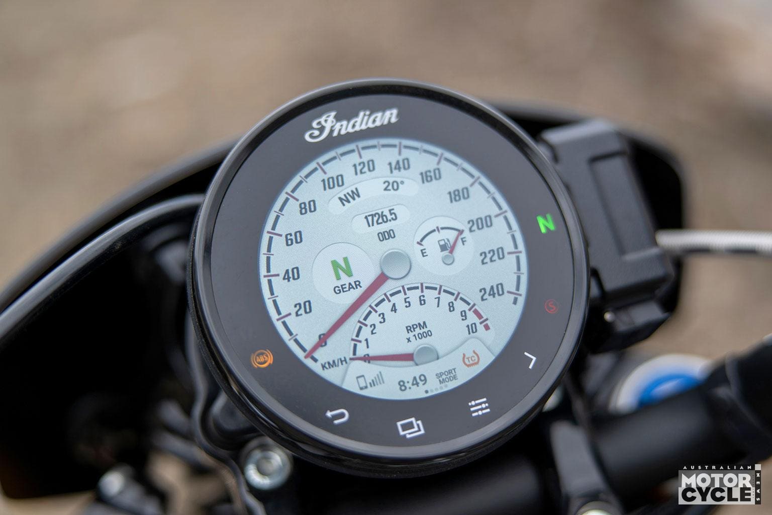 Of course, with the knobby tyres fitted you also have the option to take a dirt road shortcut if you’re so inclined. Any machine calling itself a ‘Rally’ has to be able to venture beyond the bitumen and, while I have my doubts that many owners would take it off-road much, I felt duty-bound to see how the Indian would handle some loose stuff. Fifty metres after turning onto my favourite stretch of gravel, an embarrassing attempt at a skid made it clear that the rear ABS was still active when the TC is off. There’s no other way to deactivate it either, which might seem like a churlish complaint but locking the rear is a genuinely useful ability on unsealed surfaces.