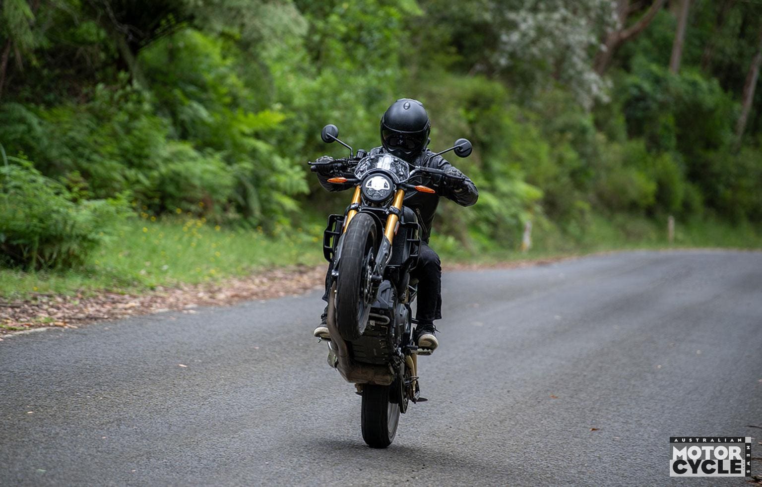 The Rally snarls forward whatever gear you happen to be in when you wind on the go-grip, with the slight gruffness at low revs a more than acceptable trade-off for that stomping, big-bore, V-twin attitude. Chopping the throttle in first gear will have the front tyre pawing at the sky with the TC off, whereas in second gear the FTR has to be prodded pretty hard to get the front Pirelli off the deck, which is a bit surprising given the burly engine response.