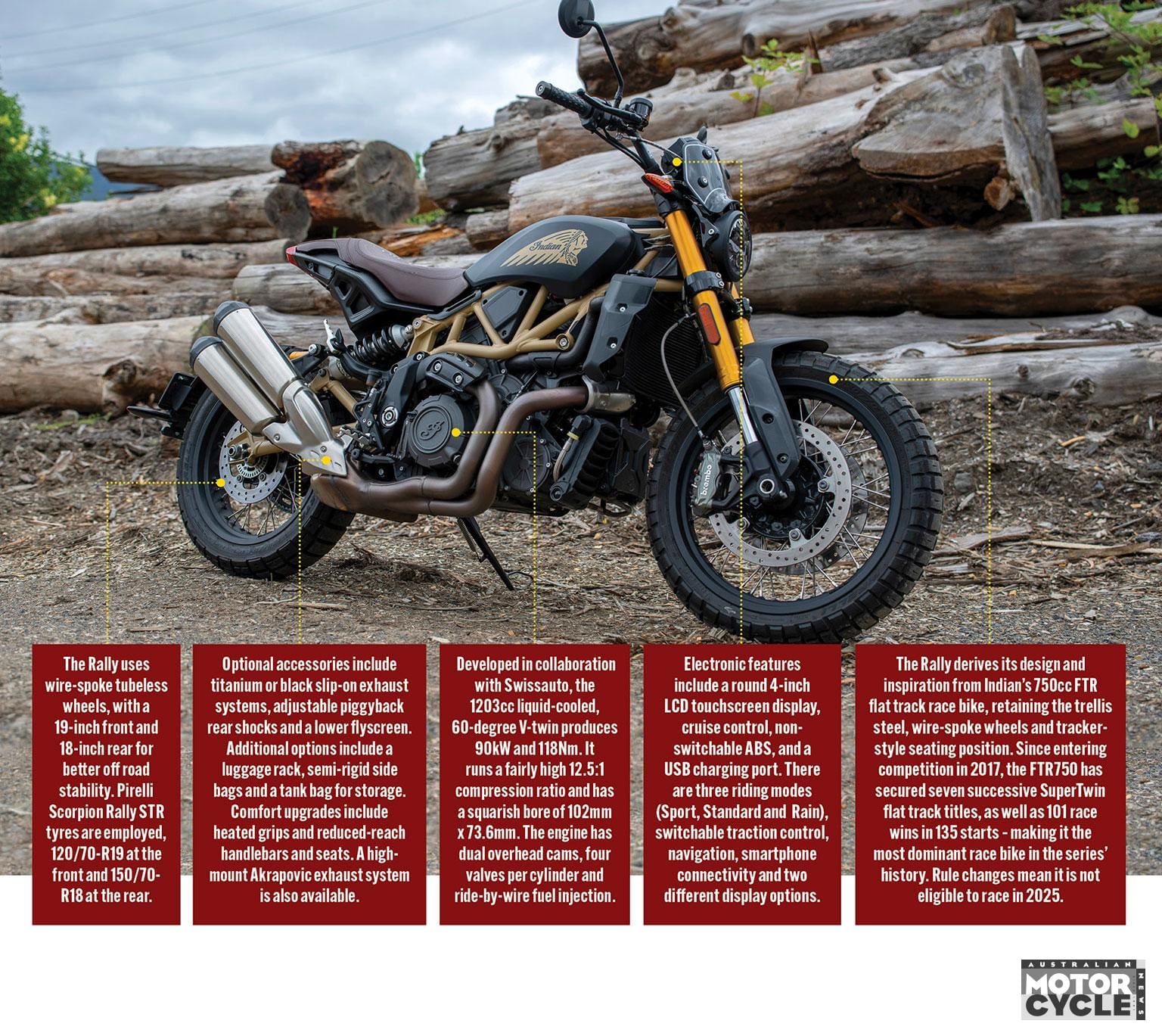The newly updated 2025 FTR Rally packs more electronic tricks and added refinement, but its 1203cc, 90kW (120.7hp), V-twin heart is still inspired by the tracker that’s been dominating dirt ovals in the US for the better part of a decade. Indian’s FTR Rally defies easy pigeonholing. Its spoked wheels sport knobby tyres, but it’s not an adventure bike. Its brawny V-twin mill isn’t obscured behind plastic fairings, but it’s not a naked bike in the traditional sense. The chrome accents, high ‘bars and leather seat probably come closest to a retro/scrambler niche, but it’s got much heftier gonads than other bikes in that category.