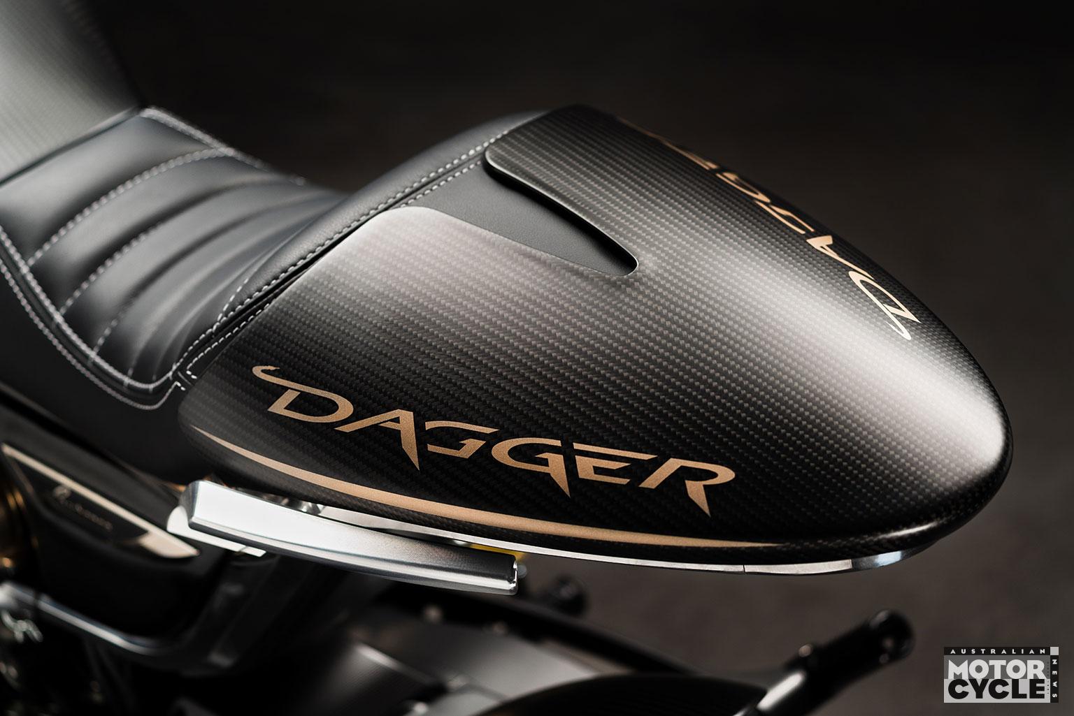 Instead, the Dagger’s 17-litre carbon fibre fuel cell pays tribute to an earlier model in Henriette’s design portfolio: the RSV1000-powered 2002 Aprilia Blue Marlin café racer he was commissioned to produce for the Italian firm, complete with the same ridged upper contours to the fuel tank and a similar super-clean, straight-line sweep for the tank and seat combo. Italian bike fans saving up to buy the production version of the Blue Marlin Aprilia had intended to build were cruelly disappointed when Piaggio dumped it after buying the bankrupt bike brand in 2004 – but now they can start saving again, albeit a little harder, to buy its stylistic descendant.