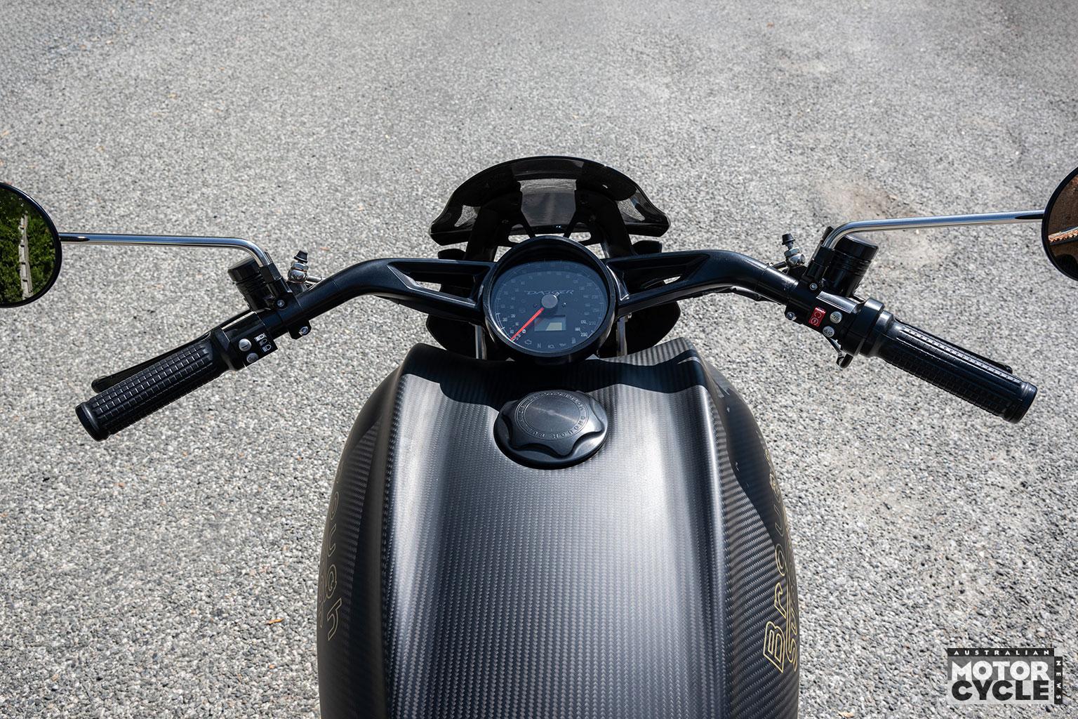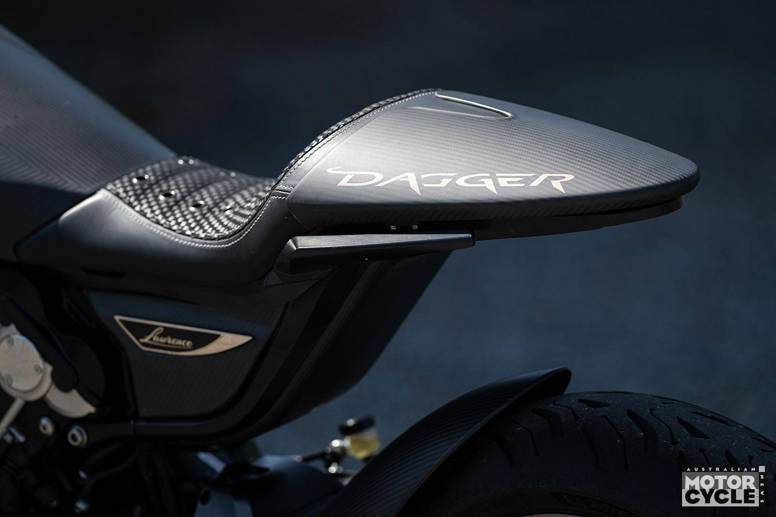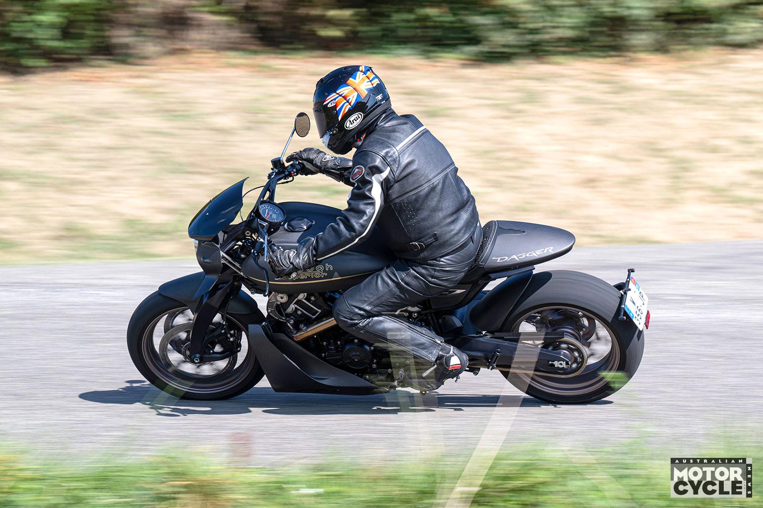 Throwing a leg over the Dagger’s two-up seat in order to verify all this number-crunching immediately showed how different it is from the Lawrence – for that seat is mounted 25mm higher at 810mm, without any problem for a 1.8m tall rider to put both feet on the ground at stoplights. There’s a quite different shape to the one-piece cast aluminium handlebar that’s actually made by Beringer the brake company, which is taller but with the fat grips pulled back to deliver a more upright, comfortable and even quite a spacious stance. This helps makes riding the Dagger in traffic easy, especially with the light-action clutch – a BIG improvement over the Ducati Monster! This has just the right amount of engine braking left dialled in to the APTC slipper mechanism – not so much that it causes chatter on the overrun from high revs, but enough to be a help in slowing for a tighter turn.