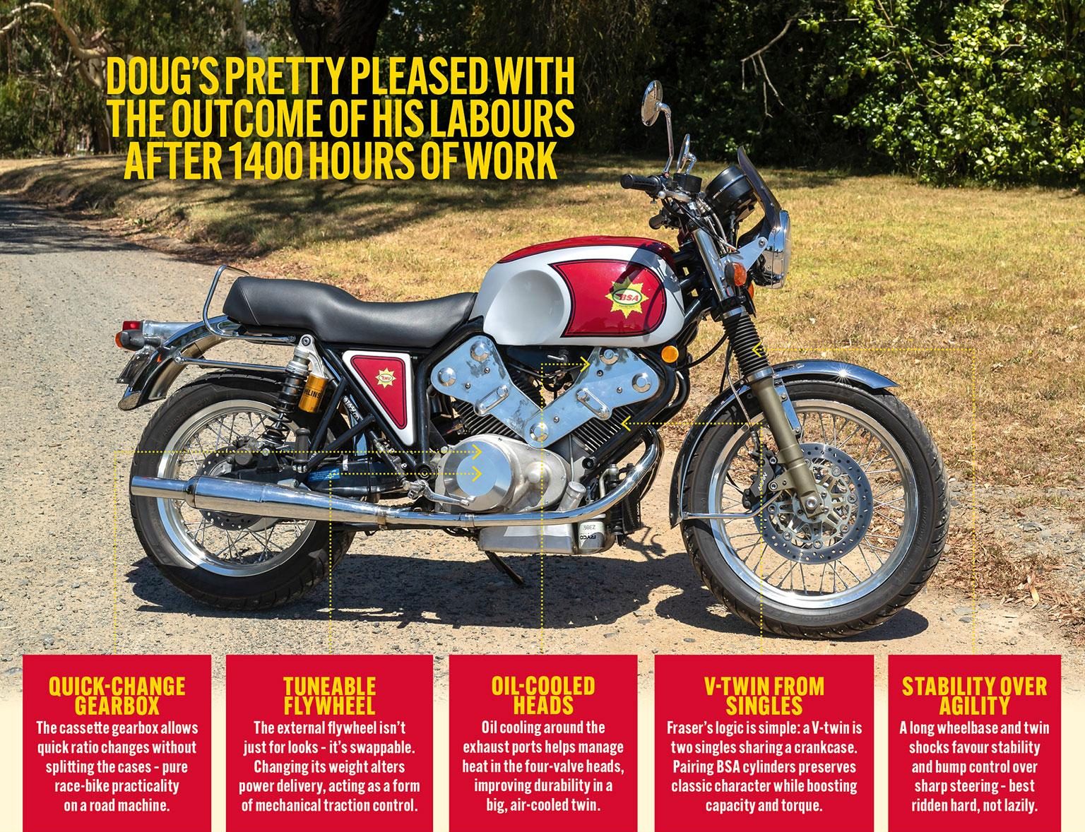 Doug’s pretty pleased with the outcome of his labours after, again, roughly 1400 hours of dedicated work: “It’s almost too fast!” he enthuses. “At 70mph on the speedo, it’s only pulling 3000revs, which is halfway to the redline. For sure it’s a 130mph bike – but I also got 55mpg on it covering 2500 miles in two weeks going to the National BSA Rally in NSW one year. It’s a really effortless long-distance ride, as well as a great country roads bike.”