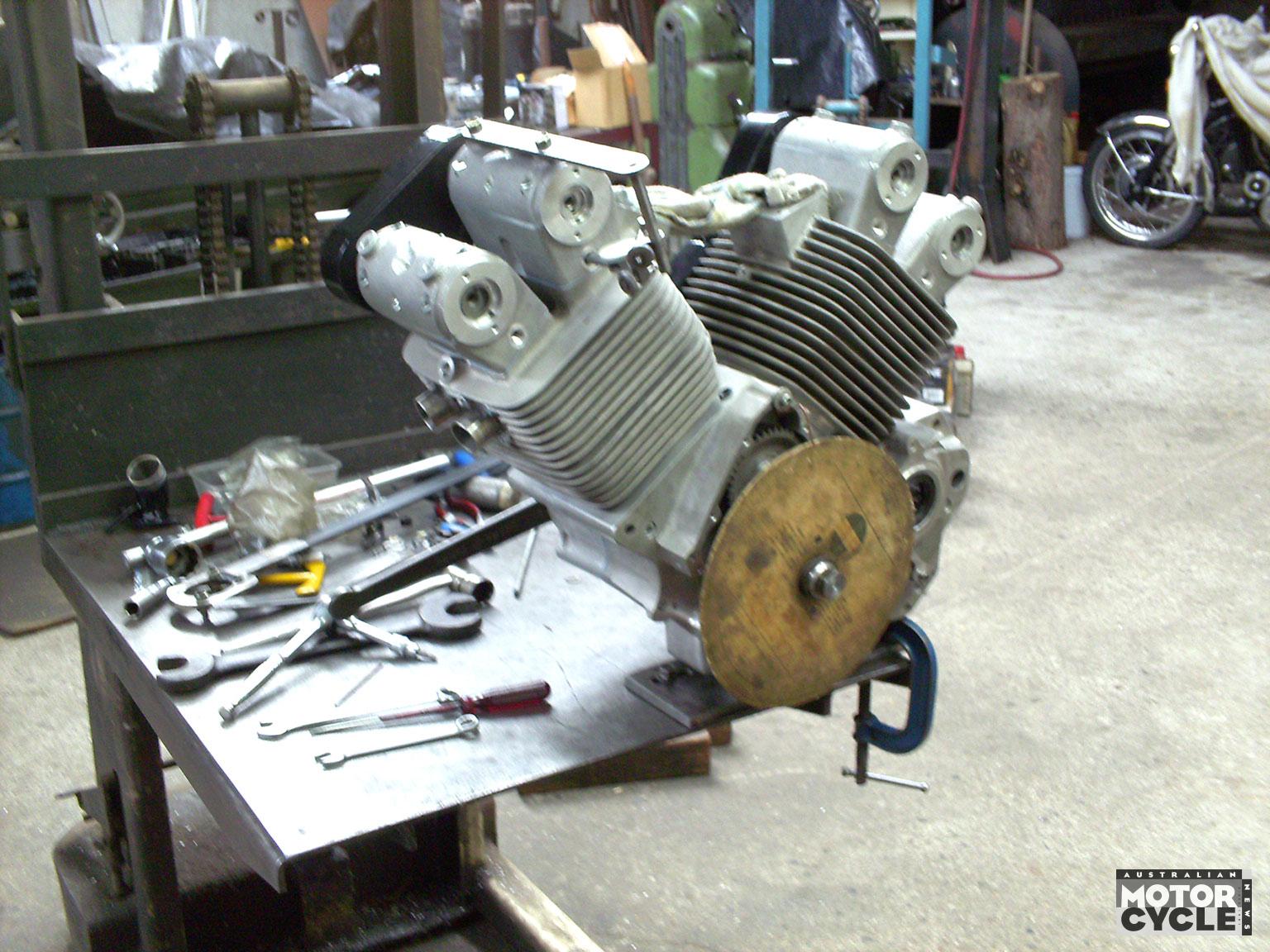 The crank’s mainshaft is 40mm in diameter, and the assembly runs on two very large roller main bearings, plus a support bush on the far right-hand side where oil is pumped into the crank. This runs a 50 per cent balance factor, same as on Fraser’s other Emu BSA creations, and carries Pankl titanium conrods bolted up side-by-side on a 53mm diameter big end, with forged Mahle pistons sourced from a flat-six Porsche 996RS delivering 11.5:1 compression, and running in Nikasil-lined Mahle sleeves.
