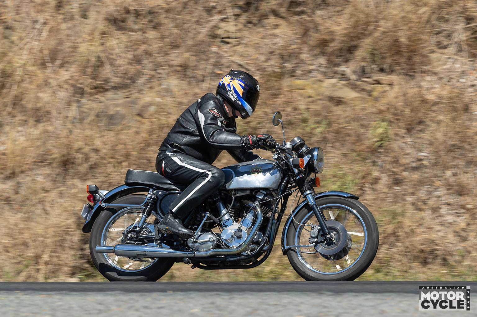 The 38mm Amal Mk2 Concentric carbs are fitted to the street legal Emu BSA E120S on which I covered 220km alongside Doug aboard his B66 on a ride through the Mornington Peninsula and South Gippsland on a sultry 36°C day.