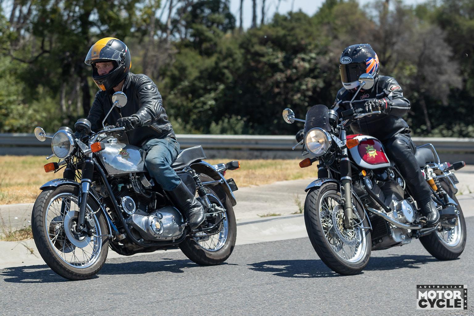 Both these bikes are powered by a meaty-looking air/oil-cooled 1194cc eight-valve DOHC dry sump engine measuring 100mm x 76mm, with narrow crankcases for extra stiffness, thanks to the hefty old-style Moto Guzzi-type bacon-slicer external flywheel on the left side, surmounted by twin cylinders set at 75º to each other, whose extensive finning originally maintained the same size and shape as the legendary BSA DBD34 Gold Star, while also being oil-cooled.