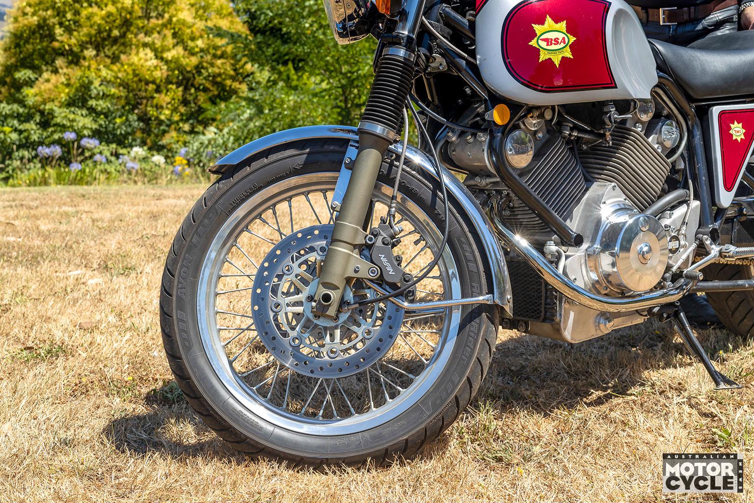 Wheels/tyres Front: 110/90-19 Avon RoadRider on 3.50in wire-laced Takasago aluminium rim