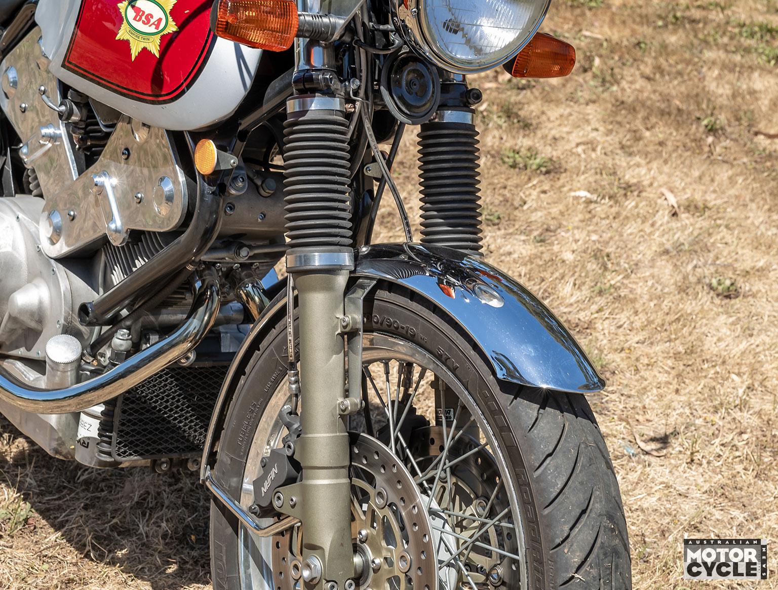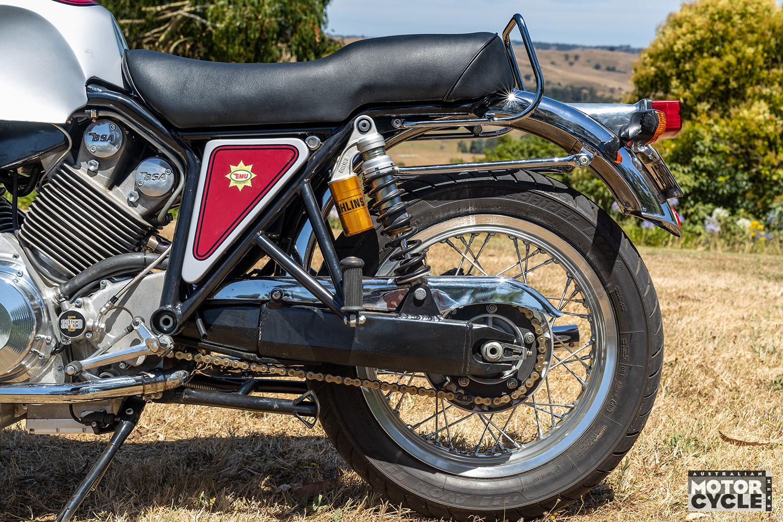 The Emu BSA’s complete front-end assembly is taken from a V-twin Honda VTR1000, with a 41mm Showa fork set at a 26º rake carrying Öhlins cartridge internals, again adjustable for preload and rebound damping. Twin 296mm VTR discs are gripped by Nissin four-piston calipers, with a 220mm rear and single-pot caliper. “The VTR runs clip-ons, but I was able to find a yoke I could use with conventional handlebars,” says Doug.