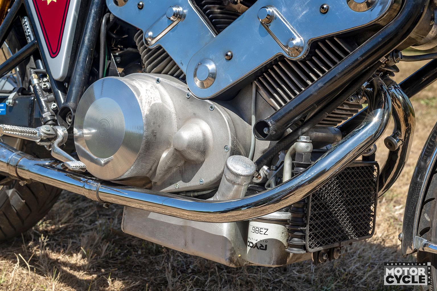 The Emu BSA 120S weighs 190kg with oil but no fuel, split 52/48 per cent, with fuel contained in a five-piece 17-litre steel tank that Doug welded up to replace the modified Yamaha TRX one used on the racer. The evocative BSA paint job comes thanks to noted Jaguar E-Type restorer Glen Olsen.
