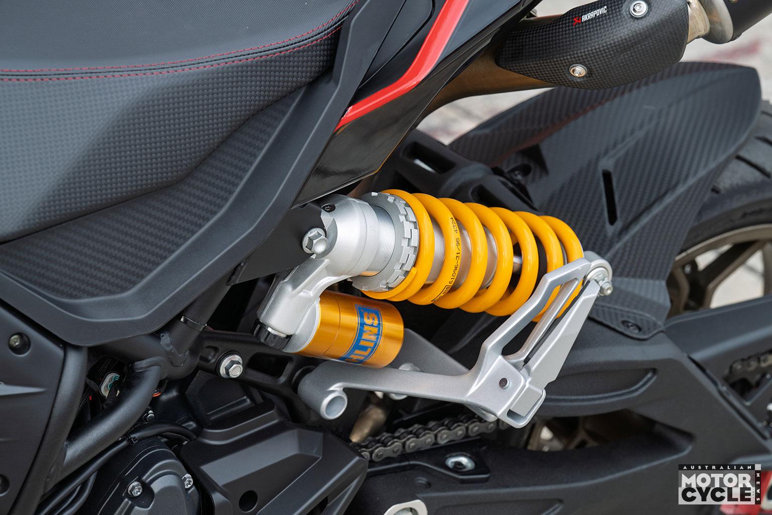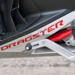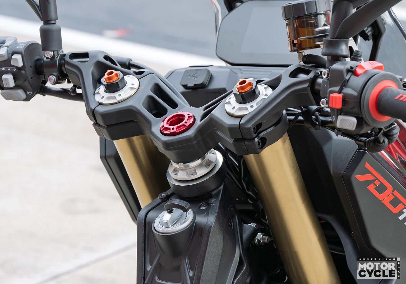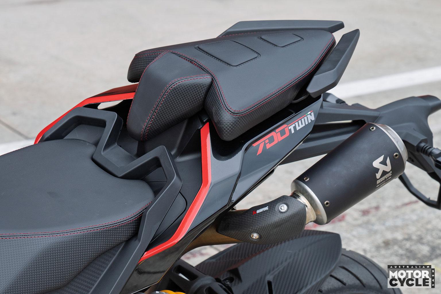 Denoting Tartarini’s intent that even the base-level Premium Edition 700 Dragster must be a class act, besides the TC and ABS it has Bluetooth connection, adjustable brake and clutch levers, LED lights front and rear, TPS/tyre pressure sensors, keyless ignition, five different languages on the ECU control package accessed via the 5-inch TFT screen, an Öhlins steering damper and an integrated camera system with front and rear views for onboard recording in the ECU. All those stock goodies go a long way to justifying the steep €13,900 (about $A25,000) price tag. Oh, and the mirrors fitted are a lesson to others – good visuals and no vibes.