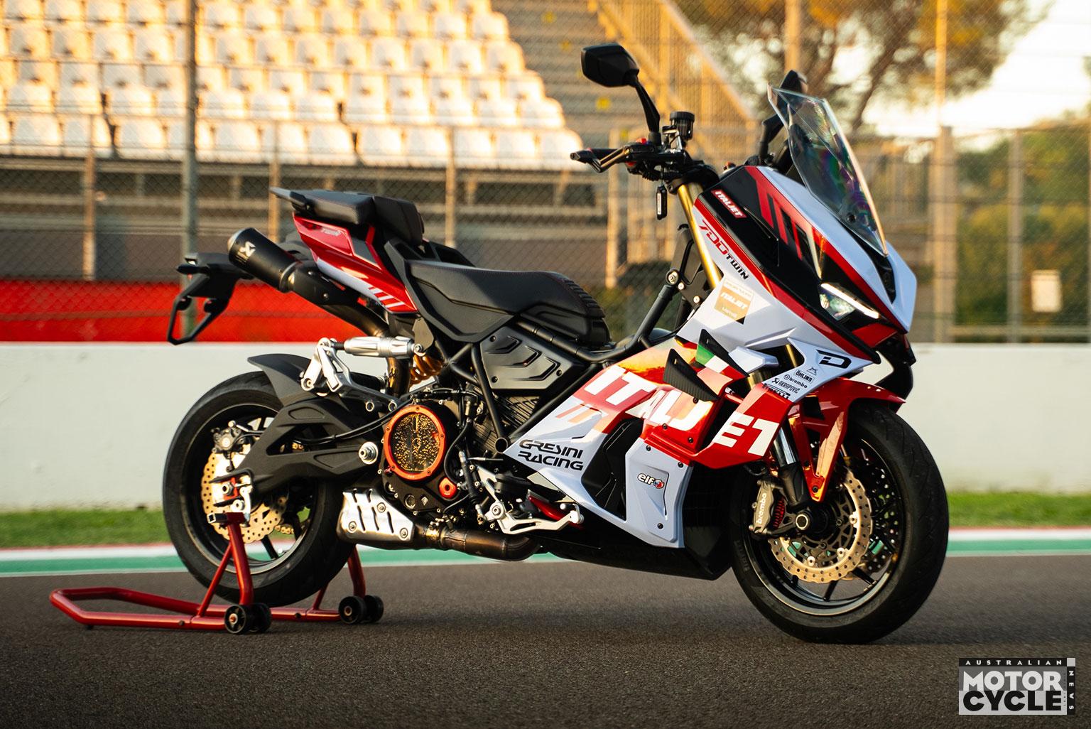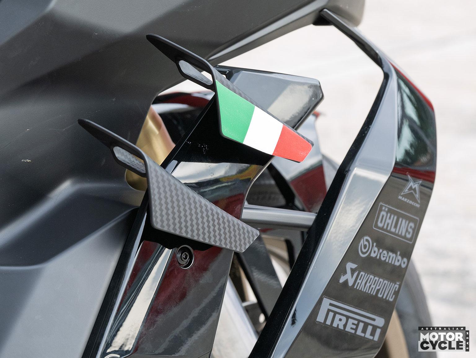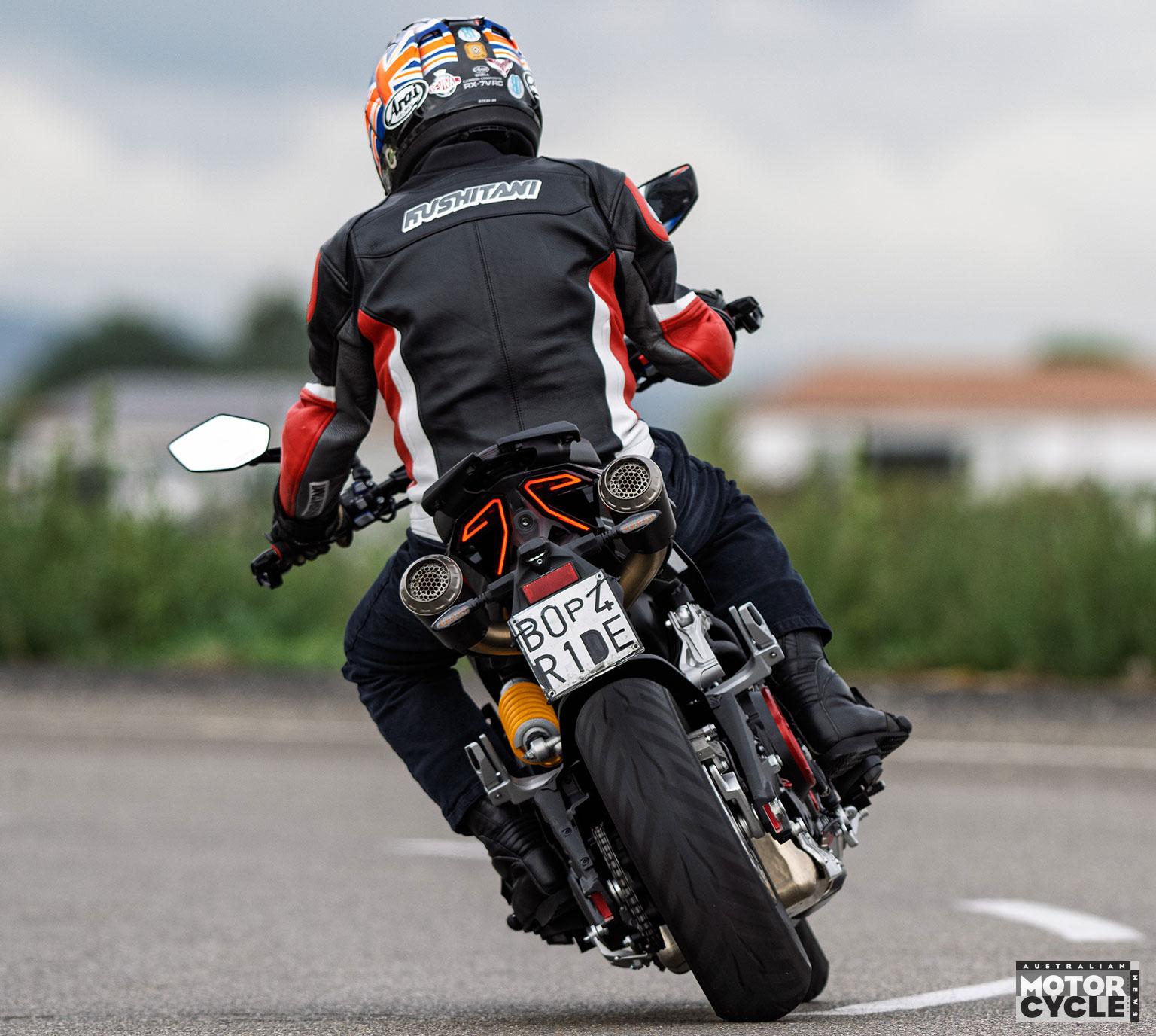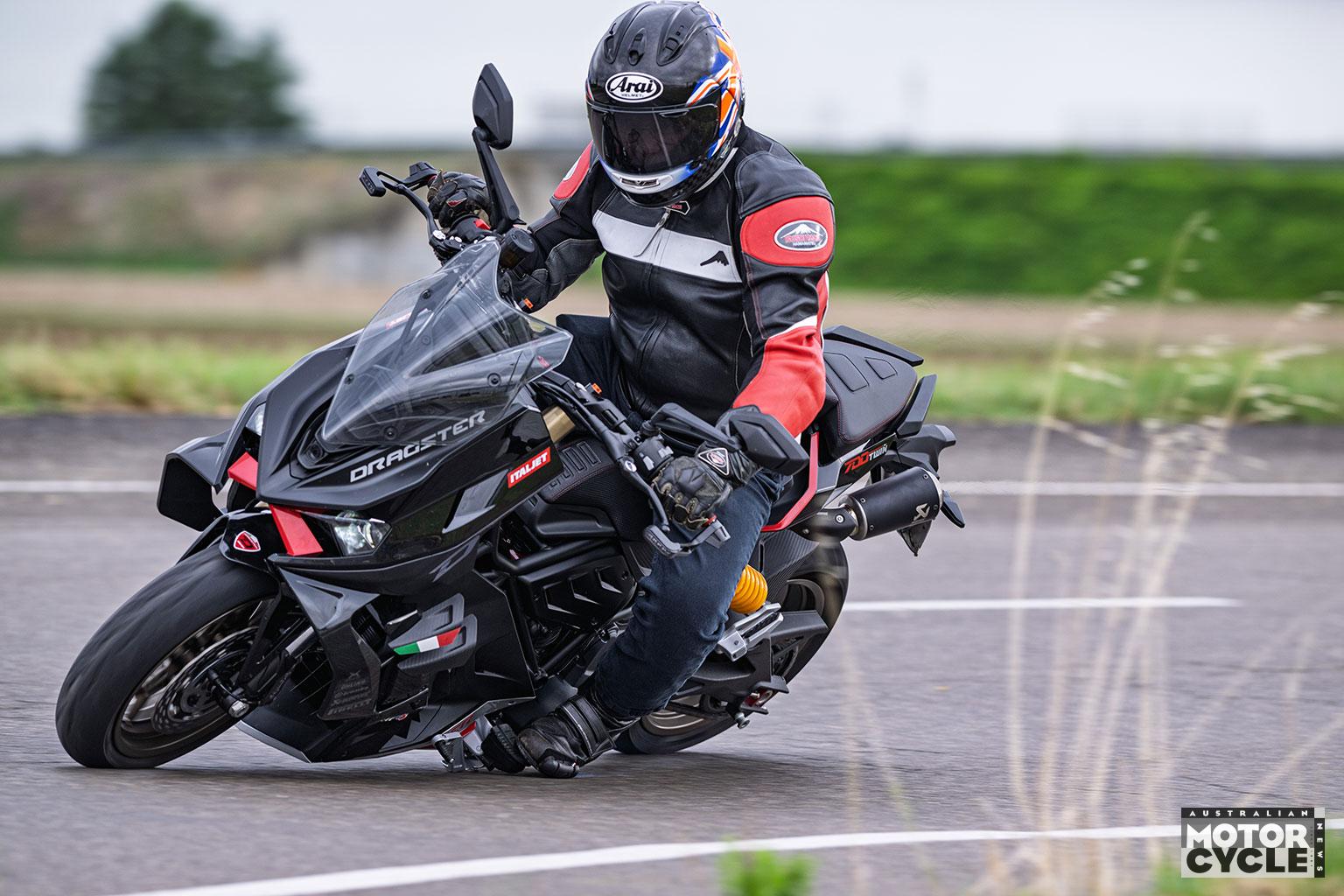 Denoting Tartarini’s intent that even the base-level Premium Edition 700 Dragster must be a class act, besides the TC and ABS it has Bluetooth connection, adjustable brake and clutch levers, LED lights front and rear, TPS/tyre pressure sensors, keyless ignition, five different languages on the ECU control package accessed via the 5-inch TFT screen, an Öhlins steering damper and an integrated camera system with front and rear views for onboard recording in the ECU. All those stock goodies go a long way to justifying the steep €13,900 (about $A25,000) price tag. Oh, and the mirrors fitted are a lesson to others – good visuals and no vibes.