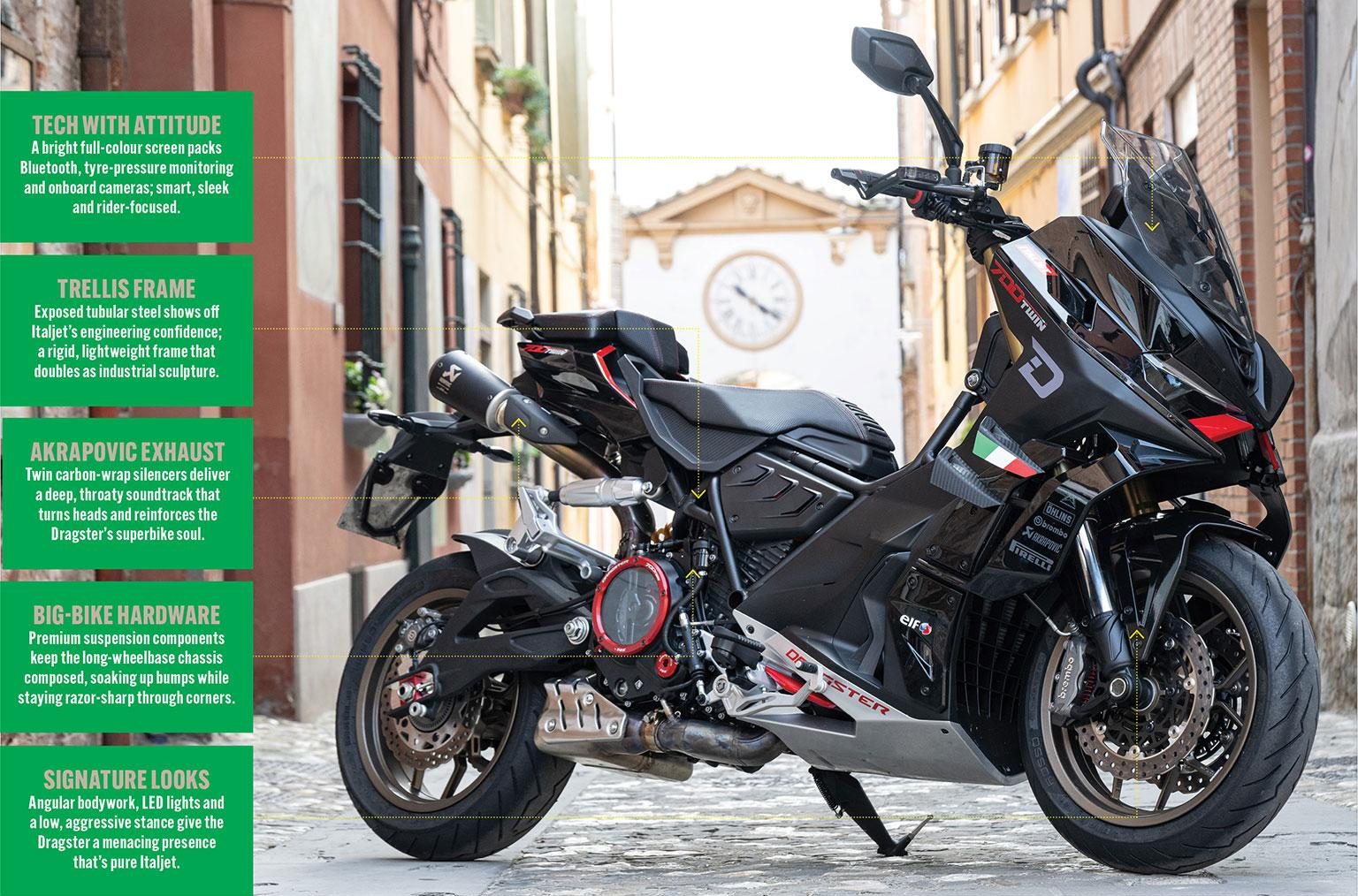The engine acts as a fully stressed chassis member housed in a vestigial tubular steel trellis frame, with a 16-litre fuel tank positioned forward of it, which Italjet claims will deliver a massive range of 370km.