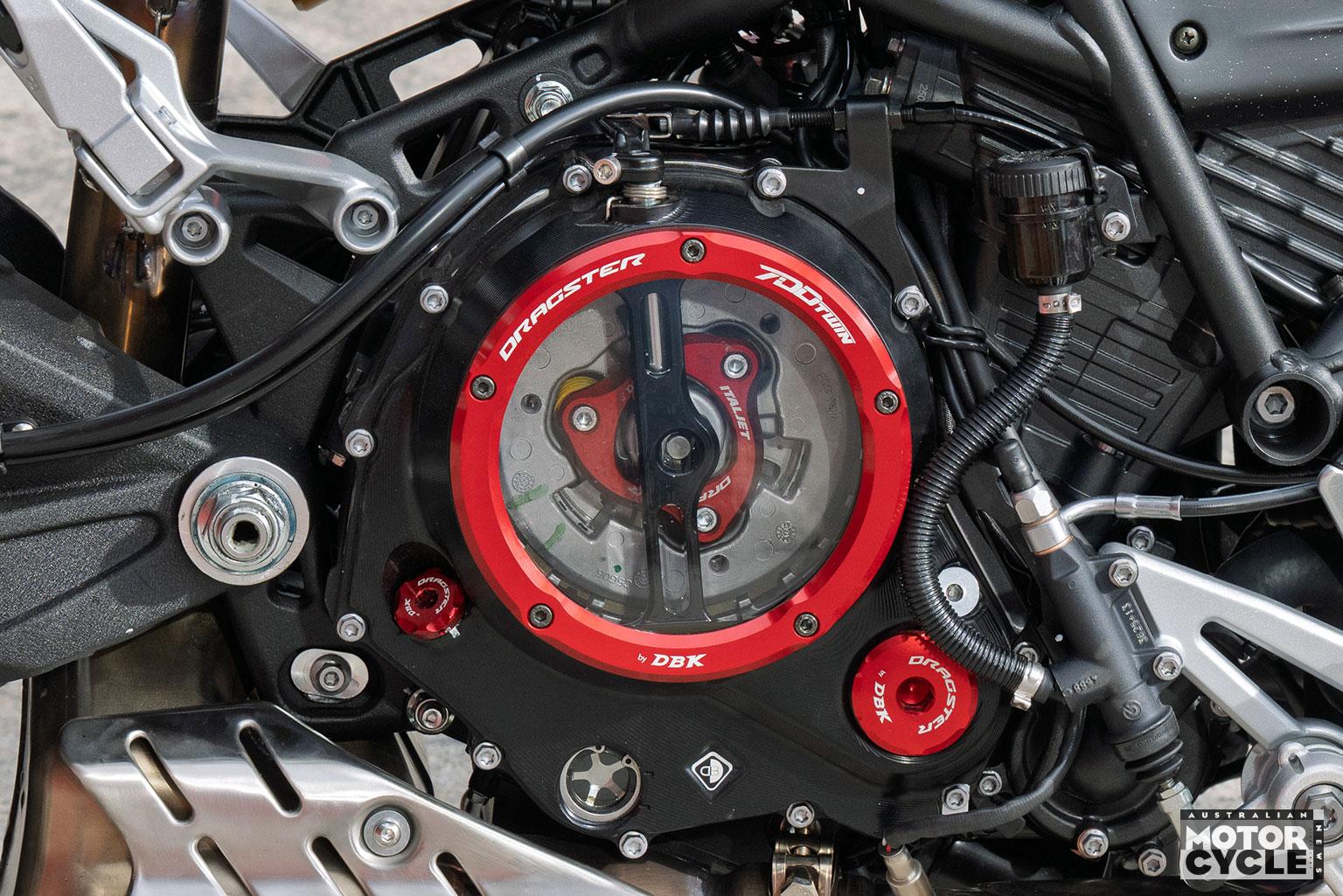 Its liquid-cooled cylinders are inclined forward by 20°, with its twin overhead camshafts chain-driven up the left side of the engine, and an 11.6:1 compression ratio. This retains the conventional-shifting six-speed gearbox, ramp-style oil-bath slipper clutch (here fitted with a distinctive DucaBike clutch cover with transparent window) and chain final drive of the Benelli model.