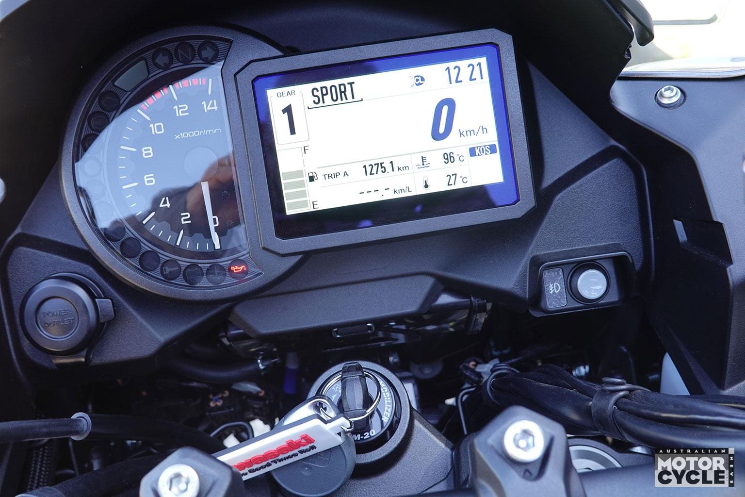 The instruments include a full colour TFT screen, the assist and slipper clutch is terrific and suspension is not really terribly long travel, but it’s fine for potholes and mild gravel. Yes, I did take the Versys out on some dry dirt and gravel back roads, and as expected the limits were set by the tyres. No complaint about the brakes on any surface though.