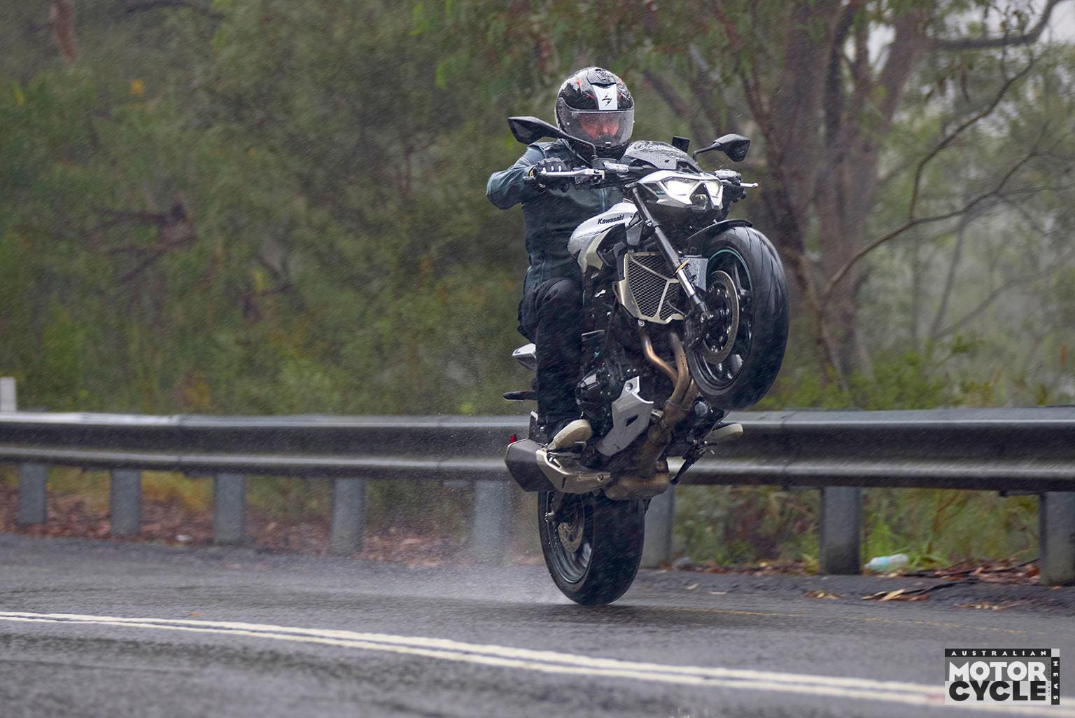 As you can see by the pics, a fair chunk of my riding on the Z was done in the rain. I wouldn’t say I love riding in the wet, but I do kind of enjoy it. Every cloud has a silver lining, right? So, I got to get a good feeling for how well the traction control goes about its business. With the Rain mode selected, the bike feels like it isn’t losing traction at all. It just drives off the turns in the wet without even a twitch, just the KTRC indicator blinking. But when the ride mode is set to Road, if you grab a handful of throttle exiting a corner, you can feel the revs rise, the bike step sideways a little but still drive forward smoothly without feeling loose or uncontrolled. It’s almost computer-game-easy now.