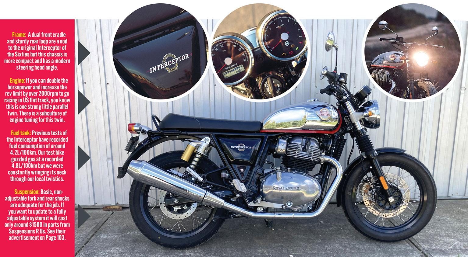 Royal Enfield marketing states: “The Interceptor 650 is a trove of 60s design staples… A dual cradle frame with a rear loop makes up the core, by way of a nod to the original Interceptor.”