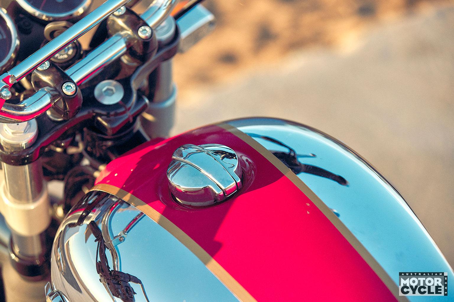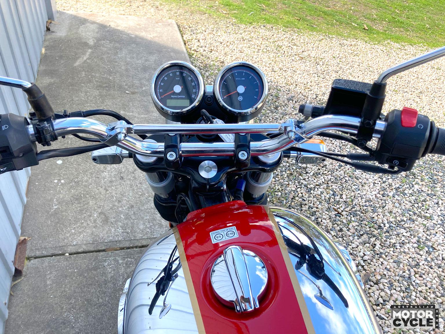 The chrome fuel tank on our test bike is an almost exact copy of the original Interceptor’s, while the digital speedo and tacho look analogue but contain integrated fuel and warning lights.